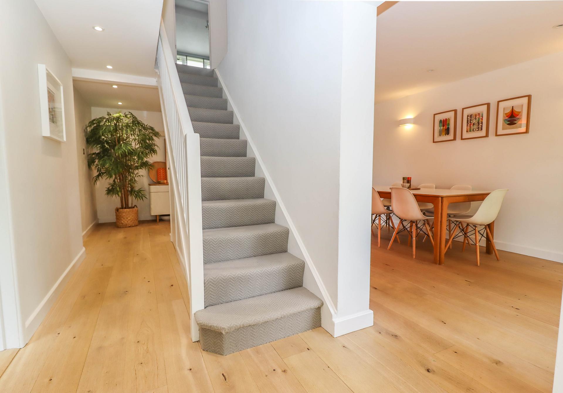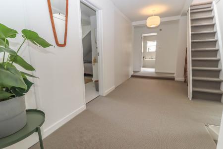 LARGE RECEPTION HALL Coir mat at threshold. Oak flooring. Stairs with balustrade to side rising to first floor. Understairs cupboard. LED down lighters. Display shelf. Two openings into dining/entertaining room. Panel door into living room.