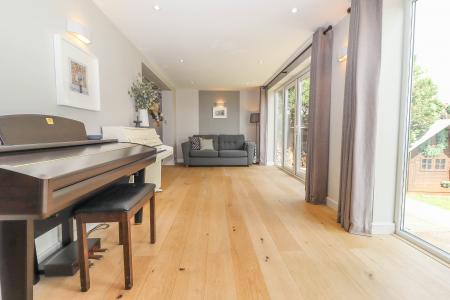 GARDEN ROOM Oak flooring. Full height glazing with two pairs of double doors opening onto terrace and rear garden. Wall lights. LED down lighters. Shelving. Opening/hatch into kitchen. Opening into: