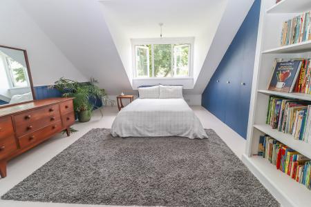 BEDROOM THREE (Large double bedroom) Built-in cupboards. T&G panelling to two walls. Pendant light point. Dormer window with views over the rear garden. Shelf.