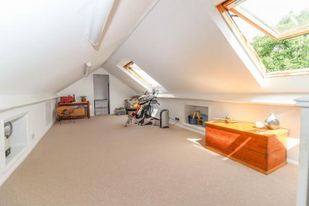 LOFT ROOM Large carpeted area with lighting and two Velux windows to the rear aspect. Eaves storage cupboards.