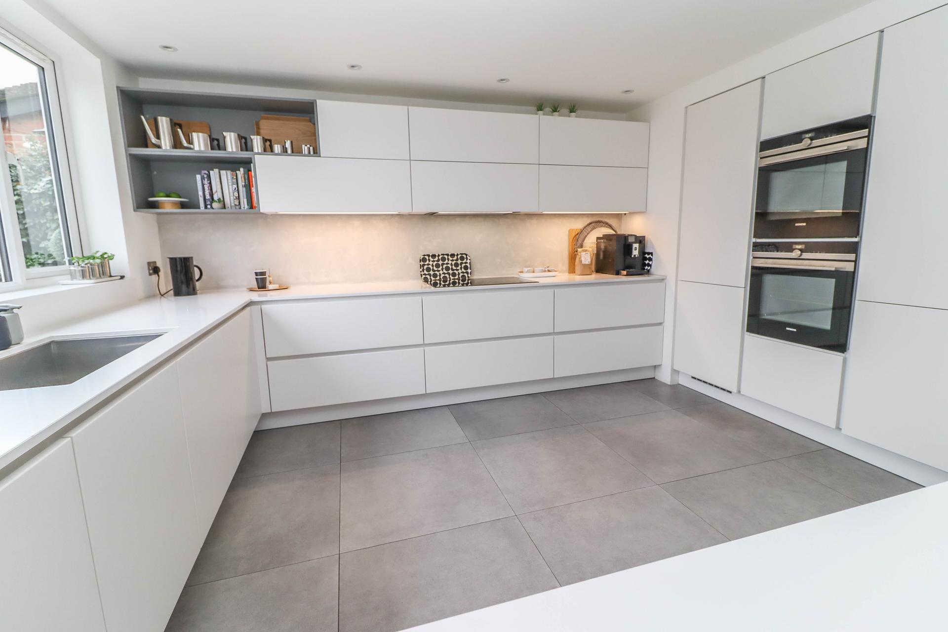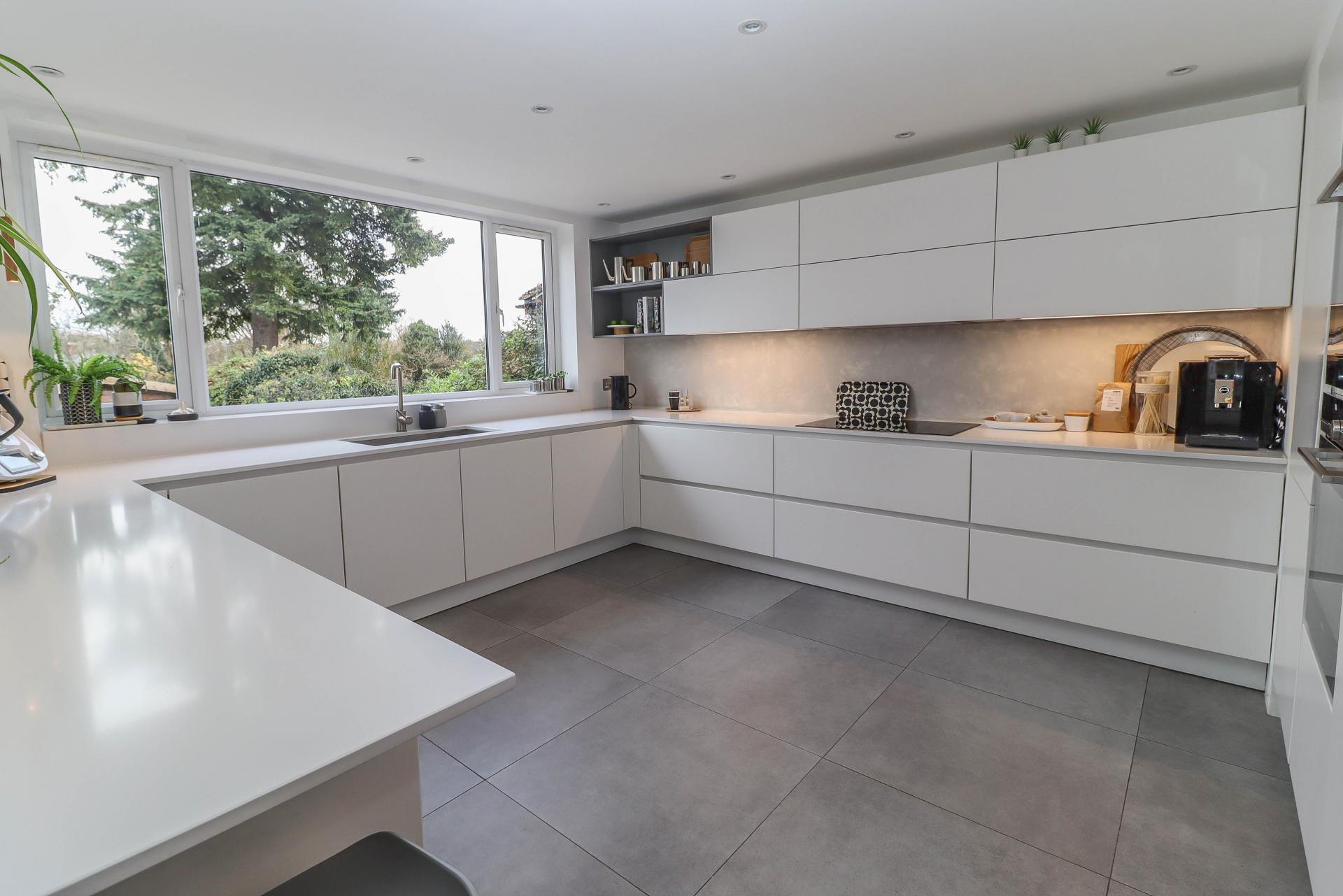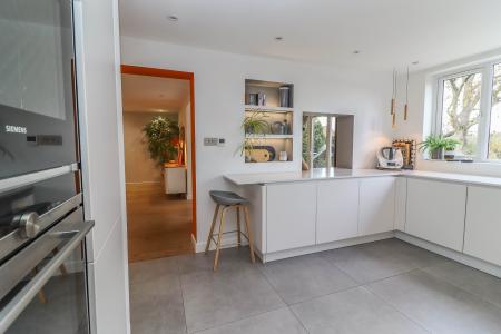 LUXURY KITCHEN (Beautifully fitted contemporary matt-white German kitchen) Polished Silestone (iconic white) worktops. Inset stainless steel twin bowl sink unit with mixer tap and Insinkerator. Comprehensive range of high and low level matt-white cupboards and drawers. Two integrated Siemens ovens. Five zone flexi Siemens induction hob with flush extractor hood above. Porcelain tiled floor with under floor heating. Integrated Bosch dishwasher, full height Bosch larder fridge and recycling unit. Down lighters. Large window overlooking rear garden. Opening/hatch to dining room with contemporary display sills and concealed lighting to either side. Feature pendant light. Opening into: