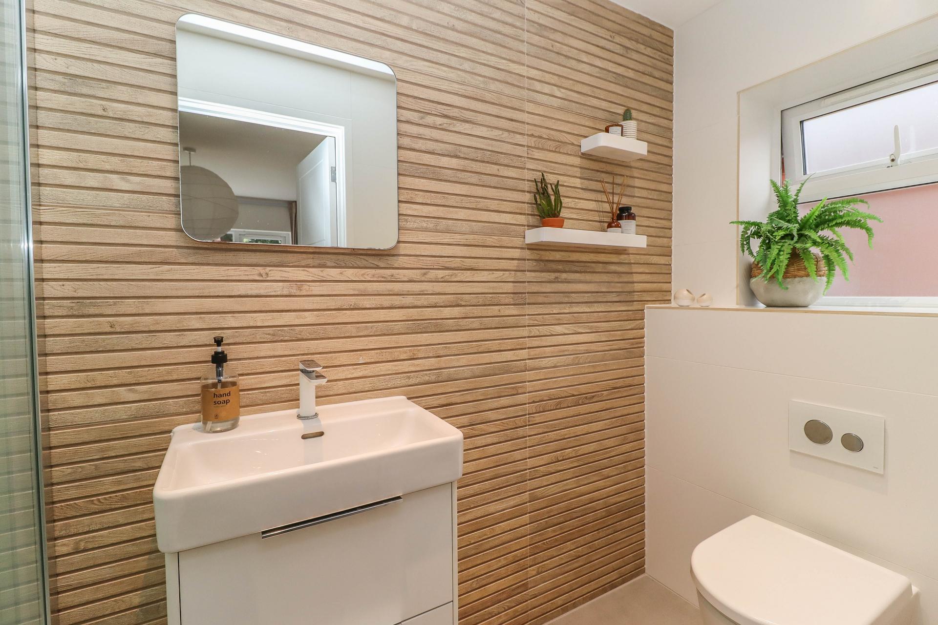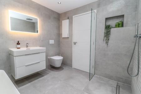 EN SUITE SHOWER ROOM (Well appointed) Feature textured timber effect porcelain tiled walls with display shelving. White suite comprising wash hand basin with mixer tap, drawers beneath. Low level WC with concealed cistern shelf above. Large tiled enclosure with overhead shower and hand attachments. Porcelain tiled floor. Towel radiator. LED down lighters. Extractor fan.