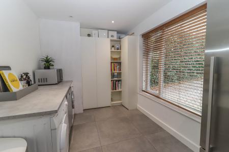UTILITY ROOM Space and plumbing for American style fridge/freezer. Full height cupboards with display shelving. Plumbing for washing machine, second dishwasher and dryer. Porcelain tiled floor with under floor heating. LED down lighters. Window to front aspect.