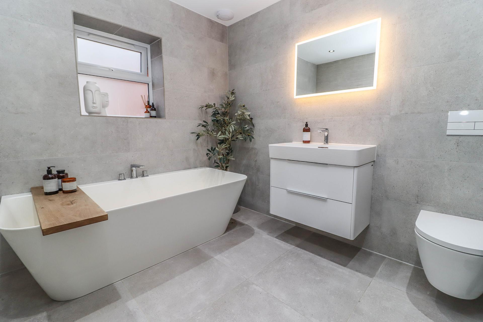 LUXURY FAMILY BATHROOM (Beautifully presented and appointed) Contemporary white suite comprising fine profile double ended bath with mixer tap. Wash hand basin with mixer tap, drawers beneath. Low level WC with concealed cistern. Corner wet area with overhead shower, hand held attachment, bottle recess and screen. Porcelain tiled floor and walls with feature textured wall. Towel radiator. LED down lighters. Obscure glazed window to side aspect. Medical cabinet. Electric mirror.