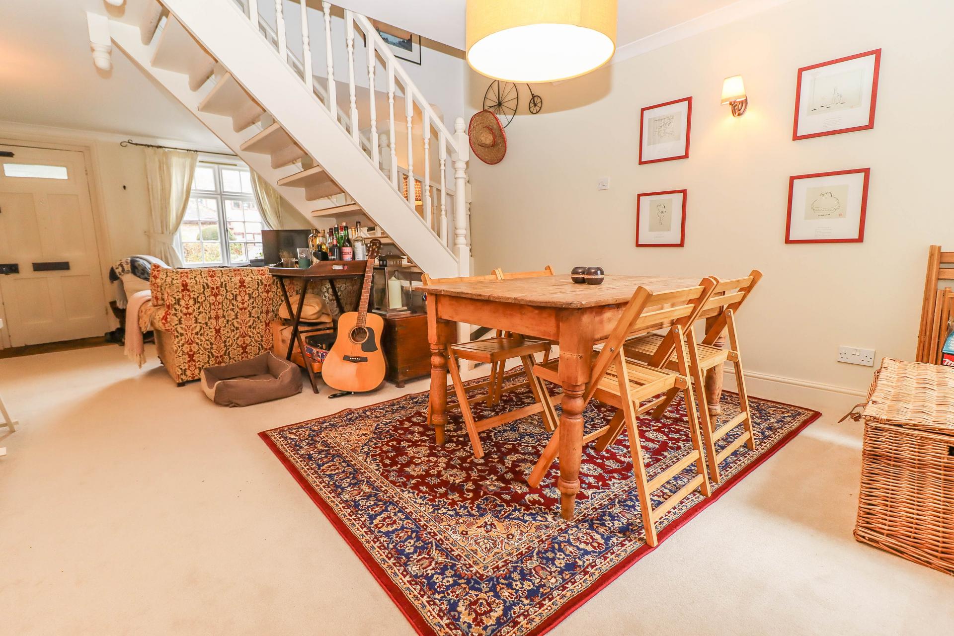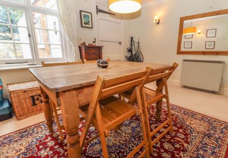 DINING ROOM Small pane window to rear aspect with view over the courtyard terrace. Pendant light point. Wall light points. Turning open tread staircase with exposed balustrade to either side rising to first floor. Panel latch door into: