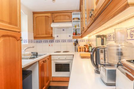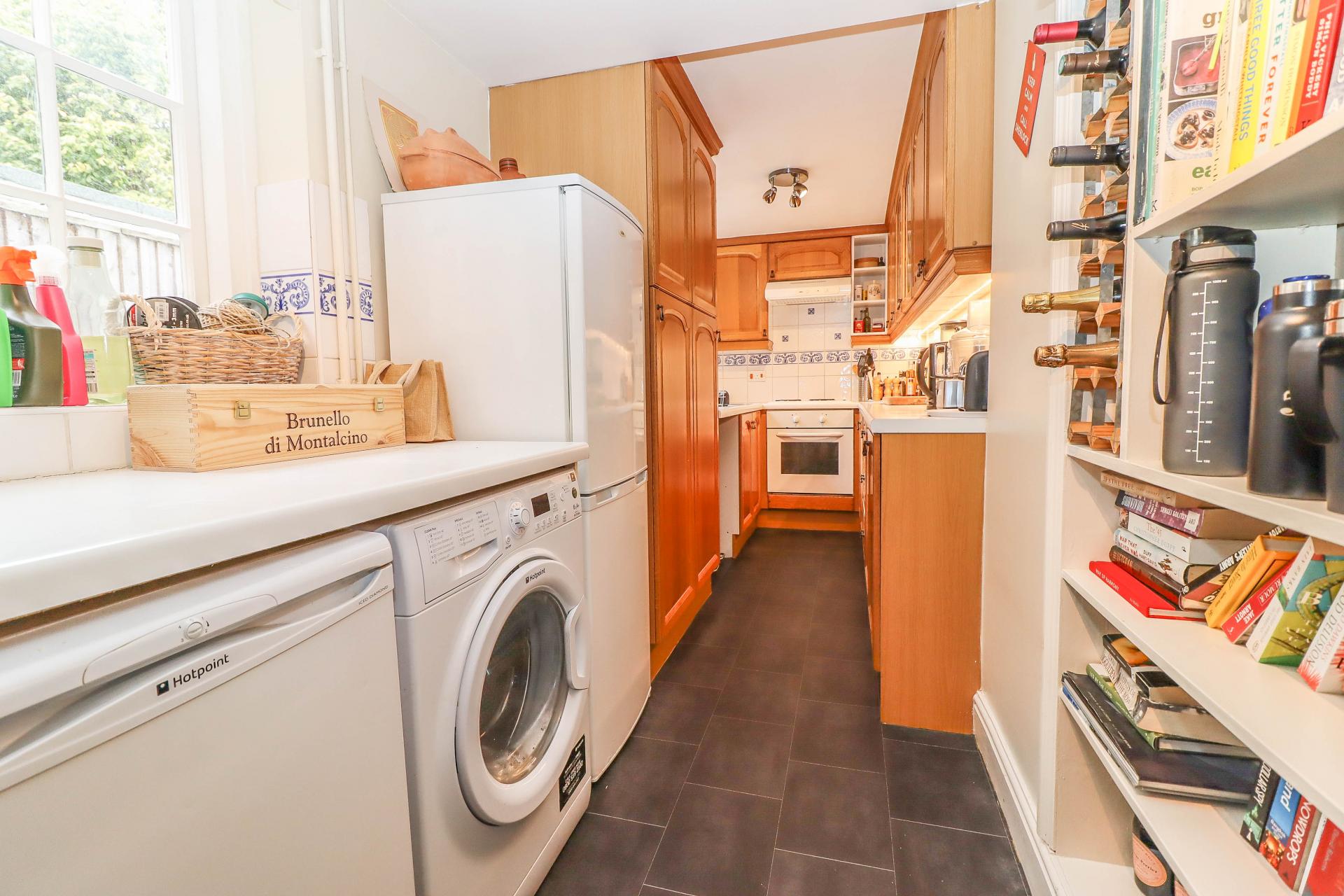 LONG GALLEY KITCHEN Comprehensive range of solid oak fronted high and low level cupboards and drawers incorporating leaded glazed display cabinets, full height shelved larder cupboard and broom store, shelving and under cupboard lighting. Wine rack. Roll top work surfaces with decorative ceramic tiled splash back. Under-counter oven/grill. Four ring electric hob above with extractor hood above. Space for upright fridge/freezer. Recess and plumbing for dishwasher. Space and plumbing for washing machine with space for dryer. Two small pane windows to side aspect. Two ceiling light points with spot lights. Slate effect flooring. Stable style door with bullseye panel to rear courtyard garden.