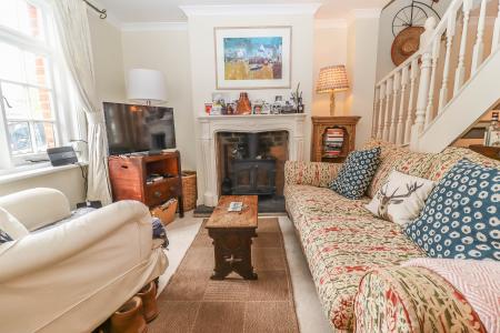SITTING ROOM Coir mat at threshold. Open fireplace housing rolled steel log burning stove on slate hearth with decorative mantelpiece. Recess to either side of chimney breast. Small pane window to front aspect with views between houses towards farmland. Cupboard housing meter/fuse boxes.