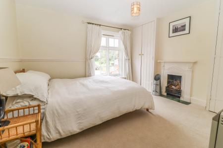BEDROOM ONE (Light and airy double bedroom) Victorian cast iron fireplace with tiled hearth and recess to either side of chimney breast with built-in wardrobe cupboards. Small pane window to front aspect with views between houses to farmland and countryside. Pendant light point. Dado rail.