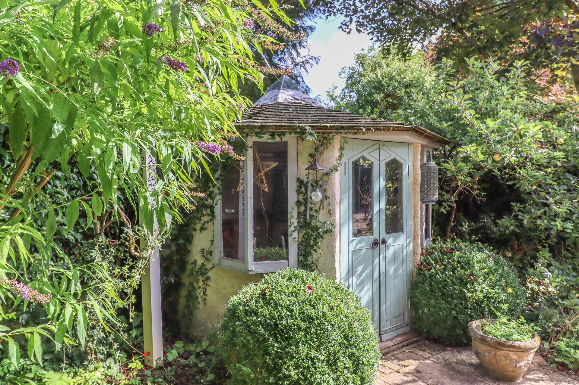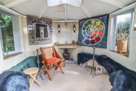 SUMMERHOUSE This is a unique feature and comprises rendered elevations beneath a shingle roof with central lantern detail. Carpeted internally with surrounding seating and fireplace with small stove. Four oriel style bay windows and double doors to front.