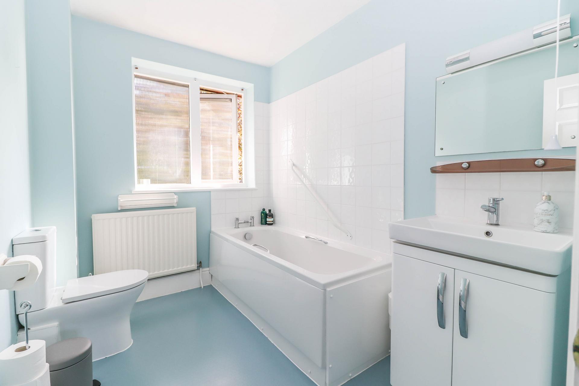 EN SUITE BATHROOM White suite comprising wash hand basin with mixer tap, tiled splash back, glass shelf, mirror and light above, cupboard beneath. Panelled bath with tiled surround. Low level WC. Obscure glazed window. Ceiling light point.