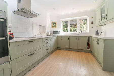 KITCHEN / BREAKFAST ROOM Stone effect work surfaces with inset twin bowl stainless steel sink unit with mixer tap and drainer. Range of high and low level cupboards, drawers and glazed display cabinets. Integrated double oven/grill. Four ring ceramic hob with tiled splash back and extractor hood above. Space for upright fridge/freezer. Window overlooking rear garden. LED down lighters. Pendant light point. Coving.