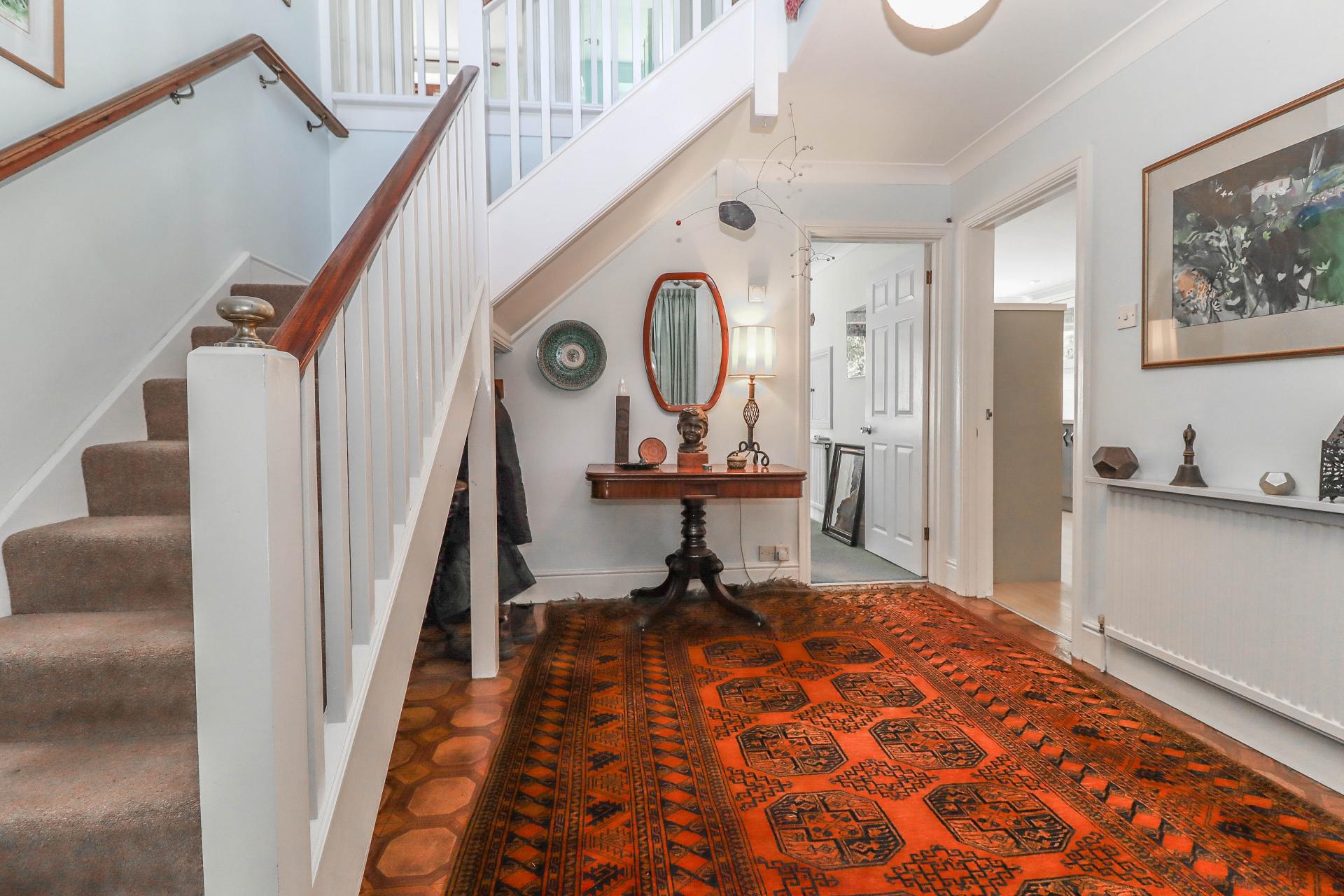 RECEPTION HALL Turning staircase with half landing and balustrade to side rising to galleried landing above. Recess beneath stairs with coat hooks. Pendant light point.