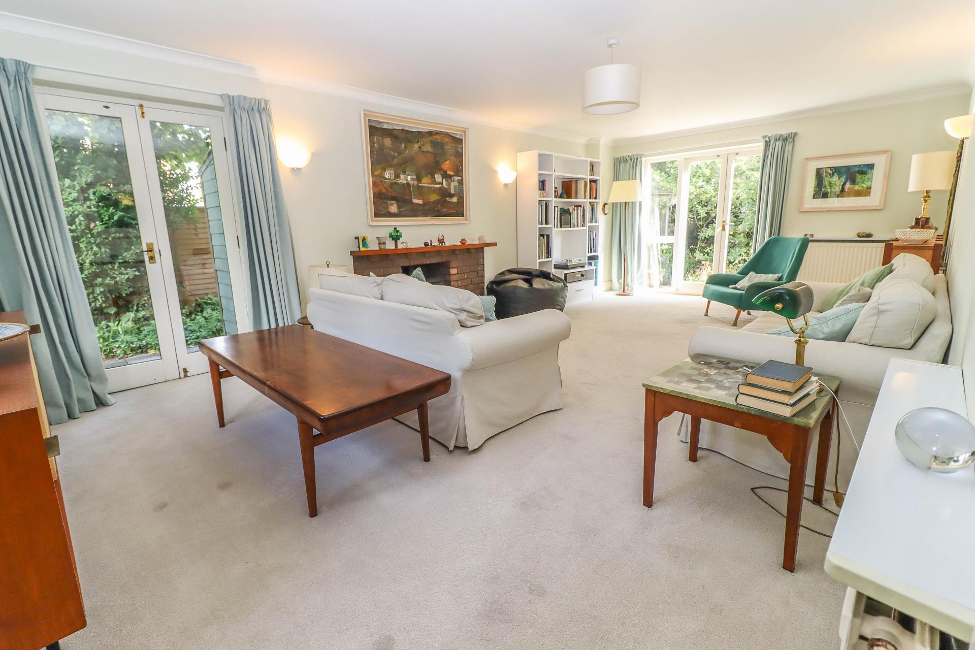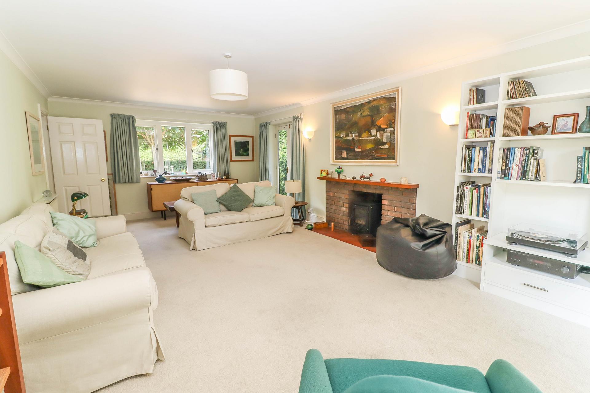 LIVING ROOM (Substantial triple aspect reception room) Brick fireplace housing rolled steel log burning stove on quarry tiled hearth, display sill over. Glazed door to rear and side. Windows to front and side aspect. Pendant light point. Wall lights. Coving.
