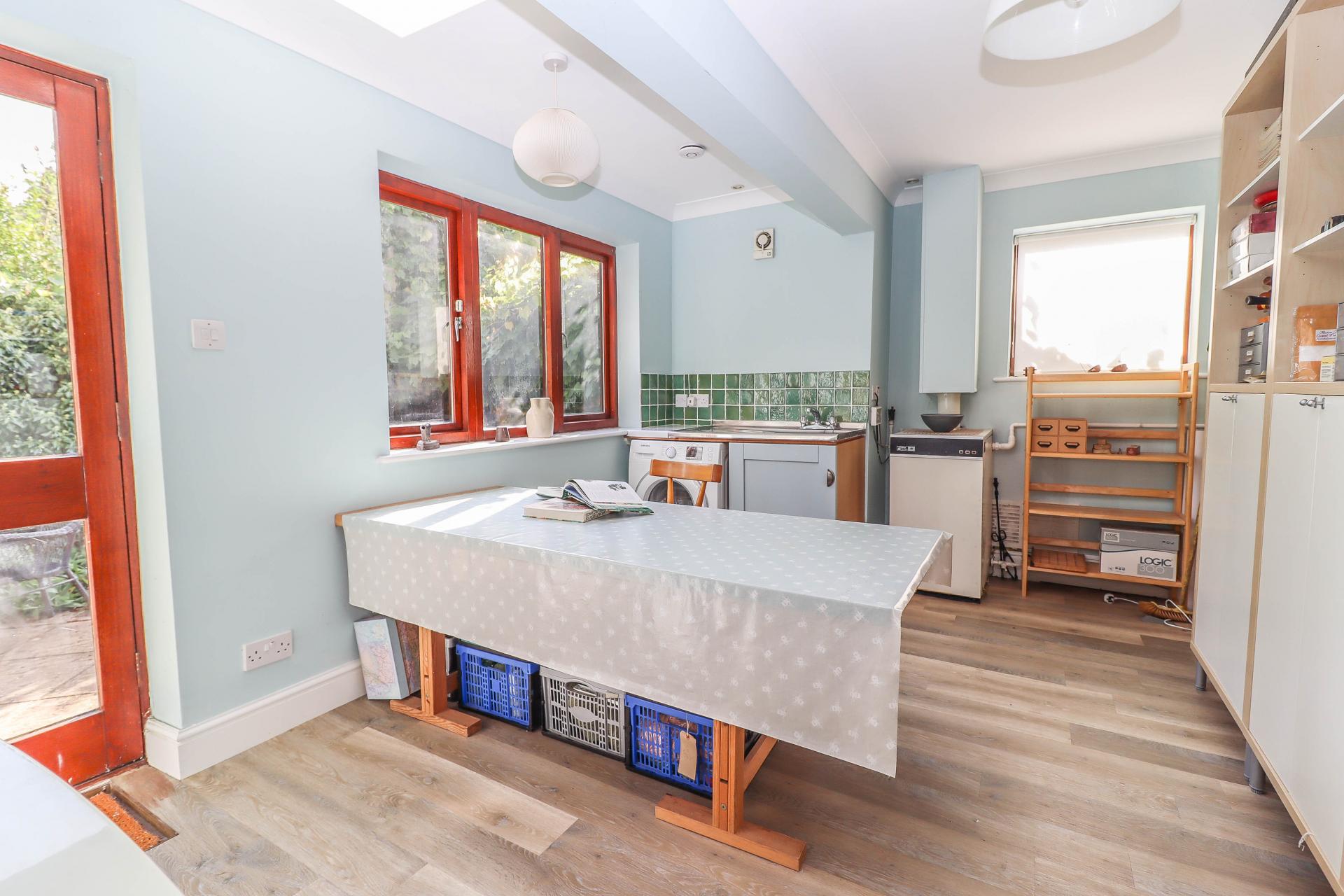 UTILITY / WORK ROOM (Large useful room) Glazed hardwood door to rear garden. Window to side aspect. Stainless steel sink unit with mixer tap and drainer, cupboard beneath. Recess and plumbing for washing machine Trianco Redfyre oil fired boiler. Coving. Pendant light points. Storage. Lantern roof light. Door into double garage.