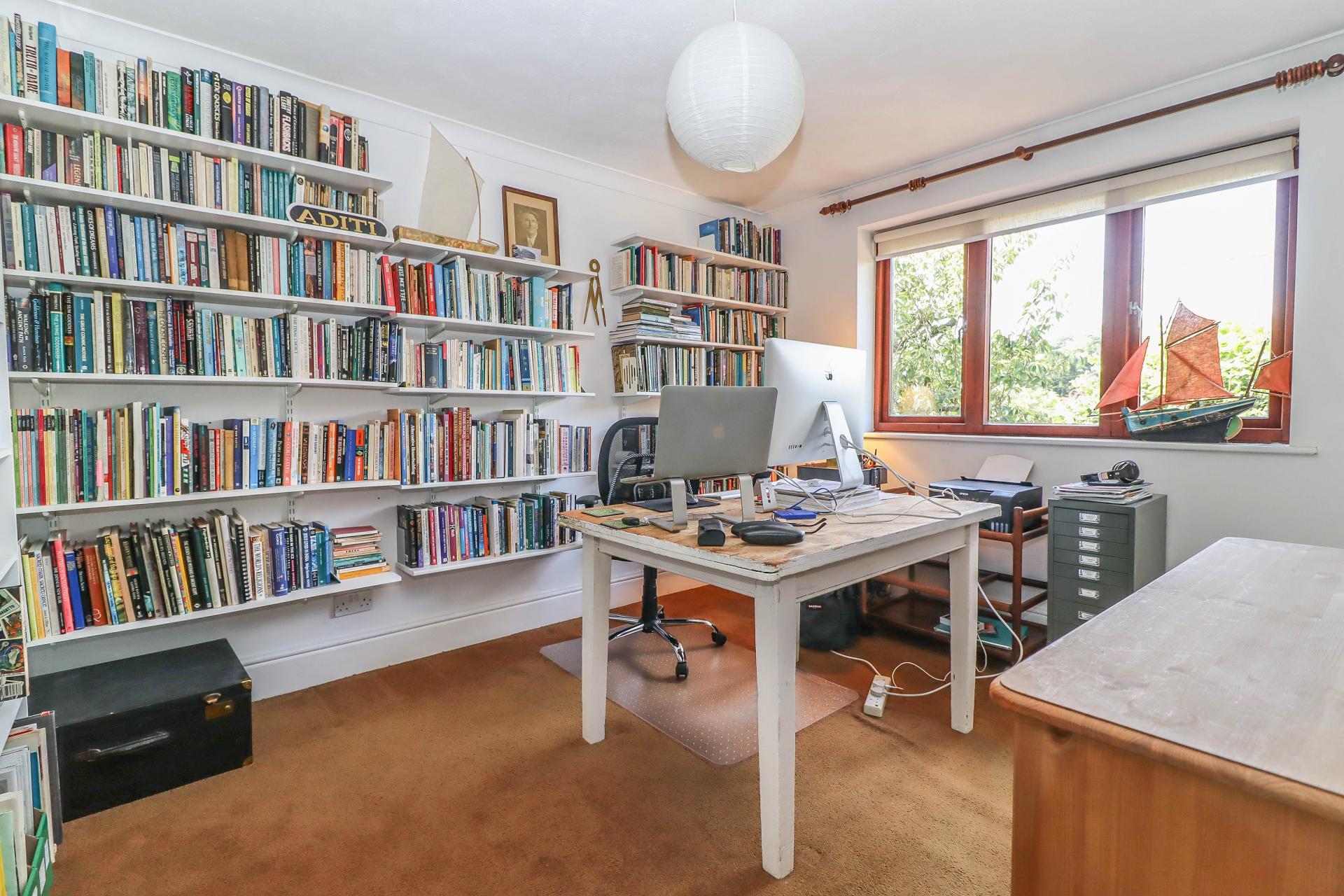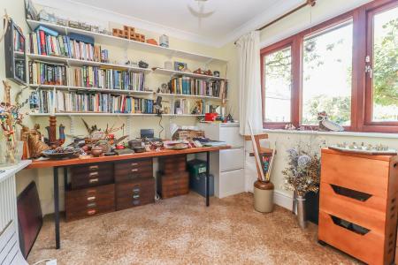STUDY / PLAY ROOM Window to front aspect. Pendant light point. Coving. Shelving. Built-in cupboards and drawers. Internal window to kitchen/breakfast room.