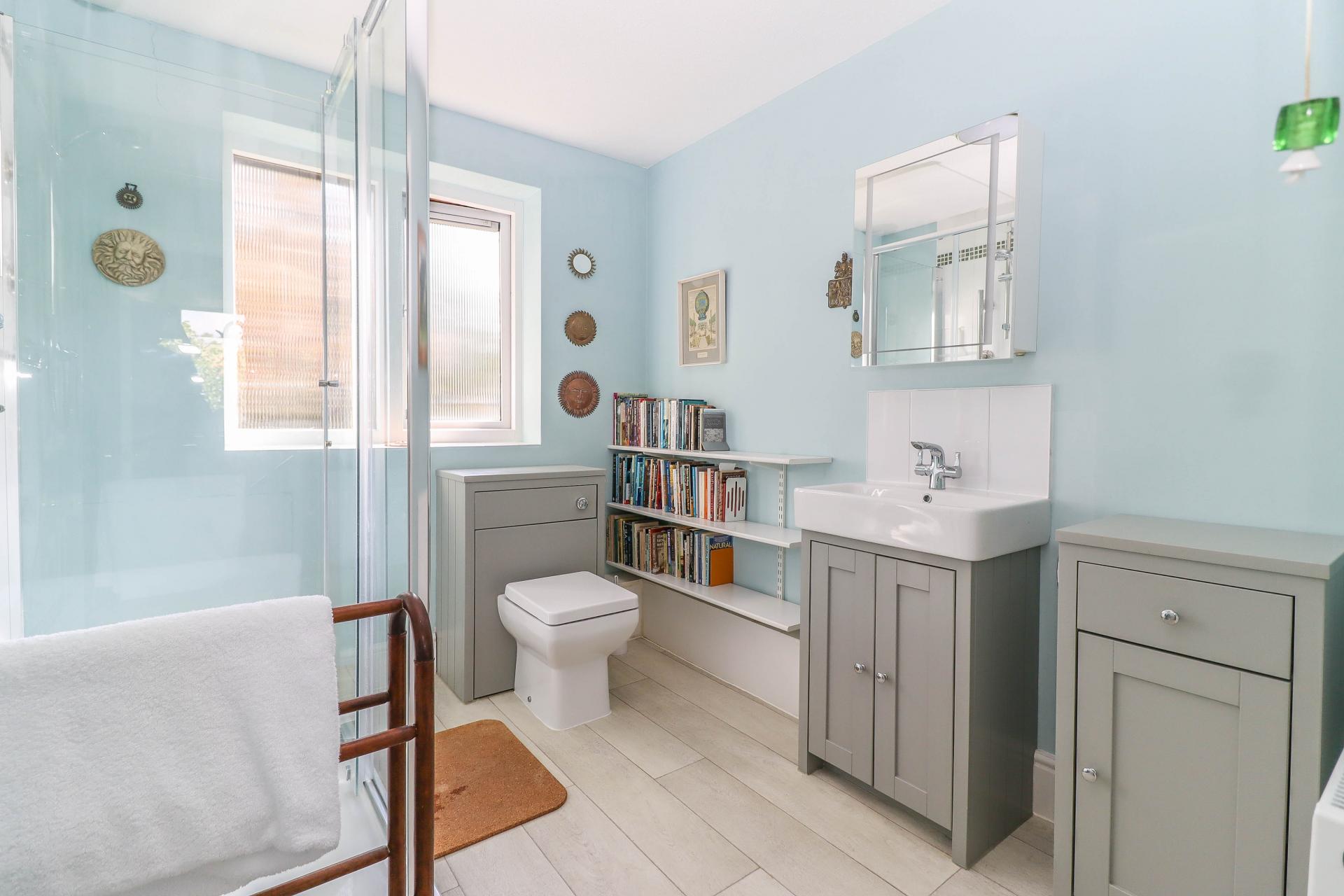 FAMILY SHOWER ROOM (Recently modernised, formerly a bathroom with space for bath and shower, if preferred) White suite comprising wash hand basin with mixer tap, tiled splash back and cupboard beneath, electric mirror fronted cupboard above. Low level WC with concealed cistern. Glass/tiled shower enclosure. Shelving. Ceiling light point. Obscure glazed window.