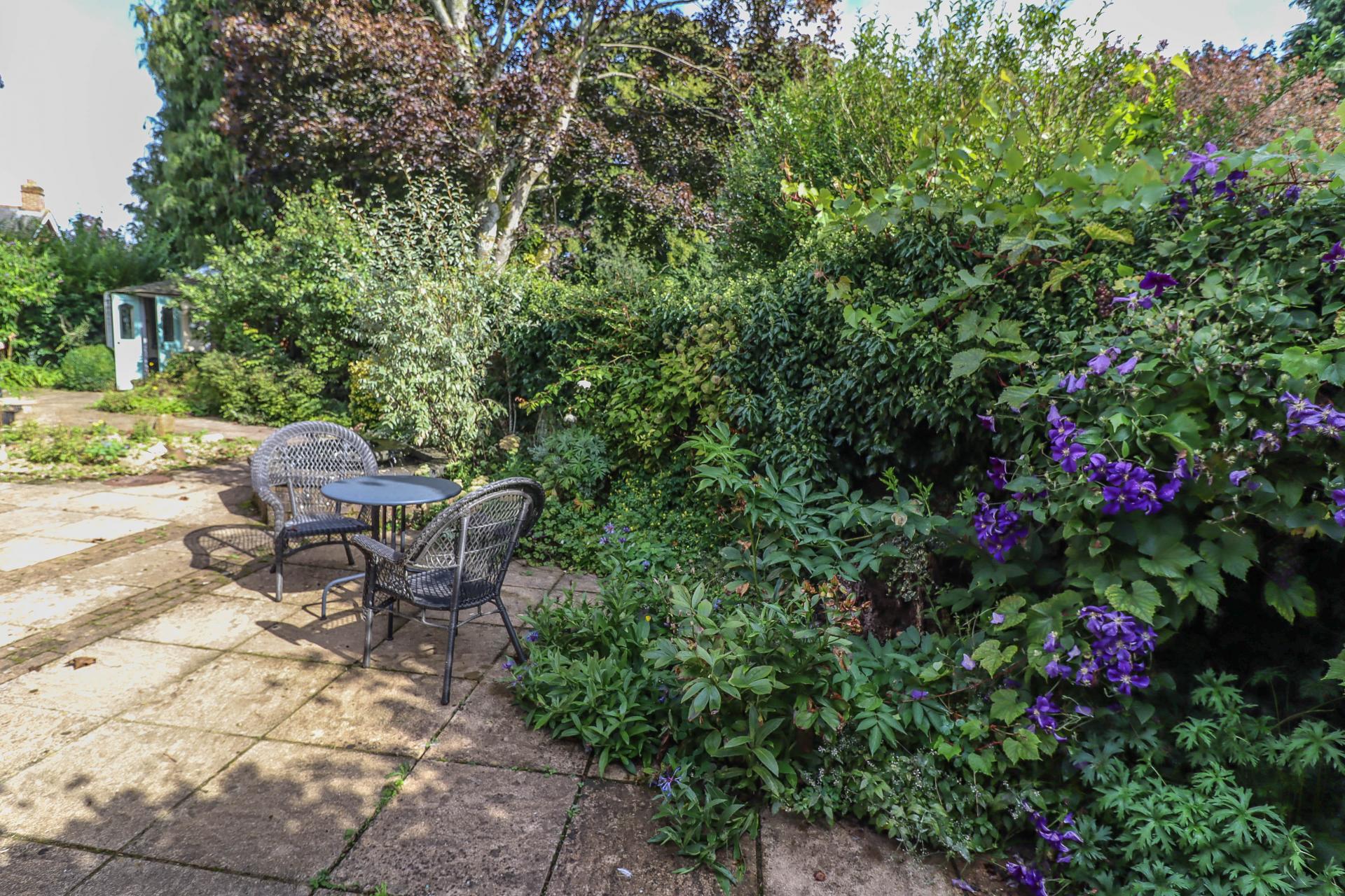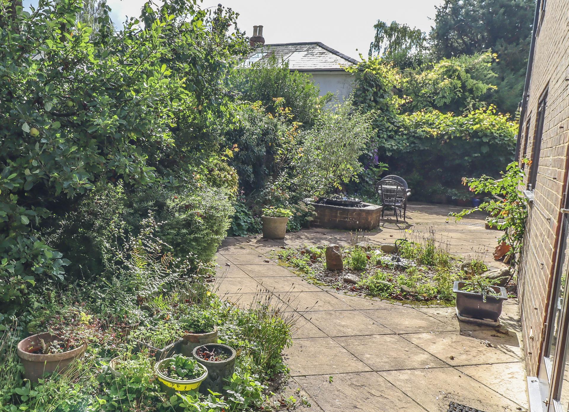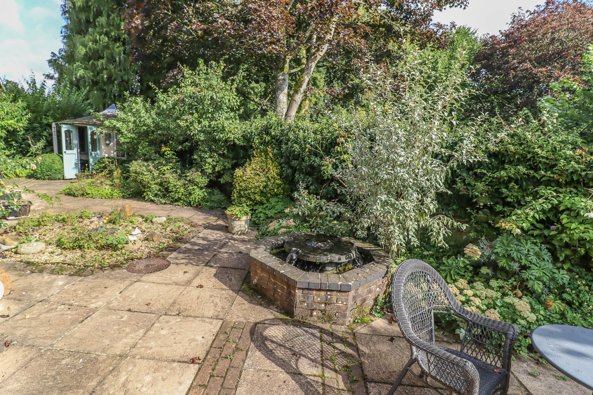 MAIN REAR GARDEN This is fairly low maintenance and landscaped as a substantial courtyard style terrace with block/paving and water feature with fountain. Block edged rose and shrub borders. The garden is well enclosed by walling, fencing, hedging and trees including apple and plum.