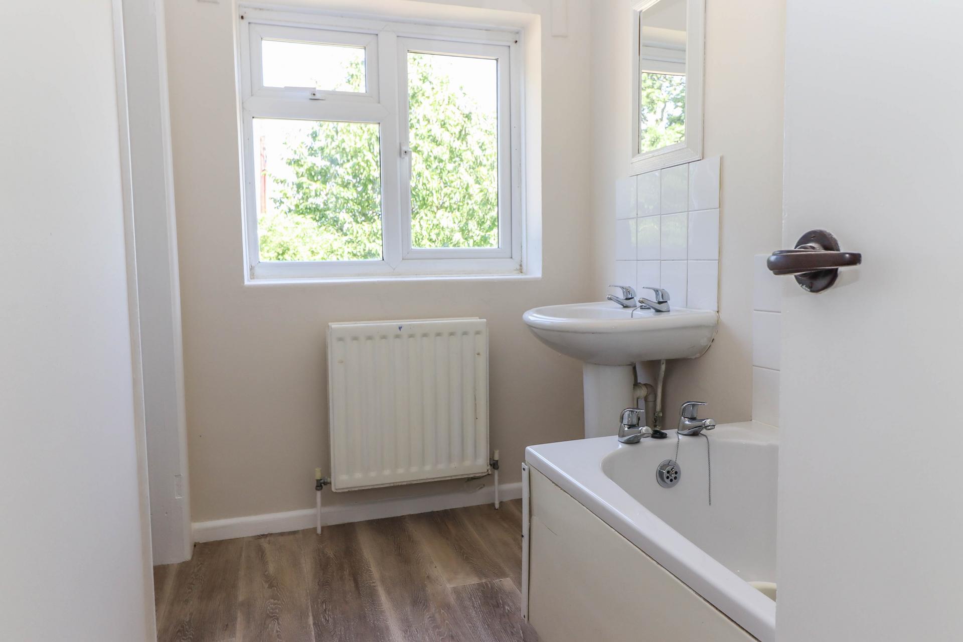 BATHROOM White suite comprising bath with tiled surround, pedestal wash hand basin with tiled splash back and low level WC. Window to side aspect with far reaching views. Oak effect flooring. Ceiling light point.