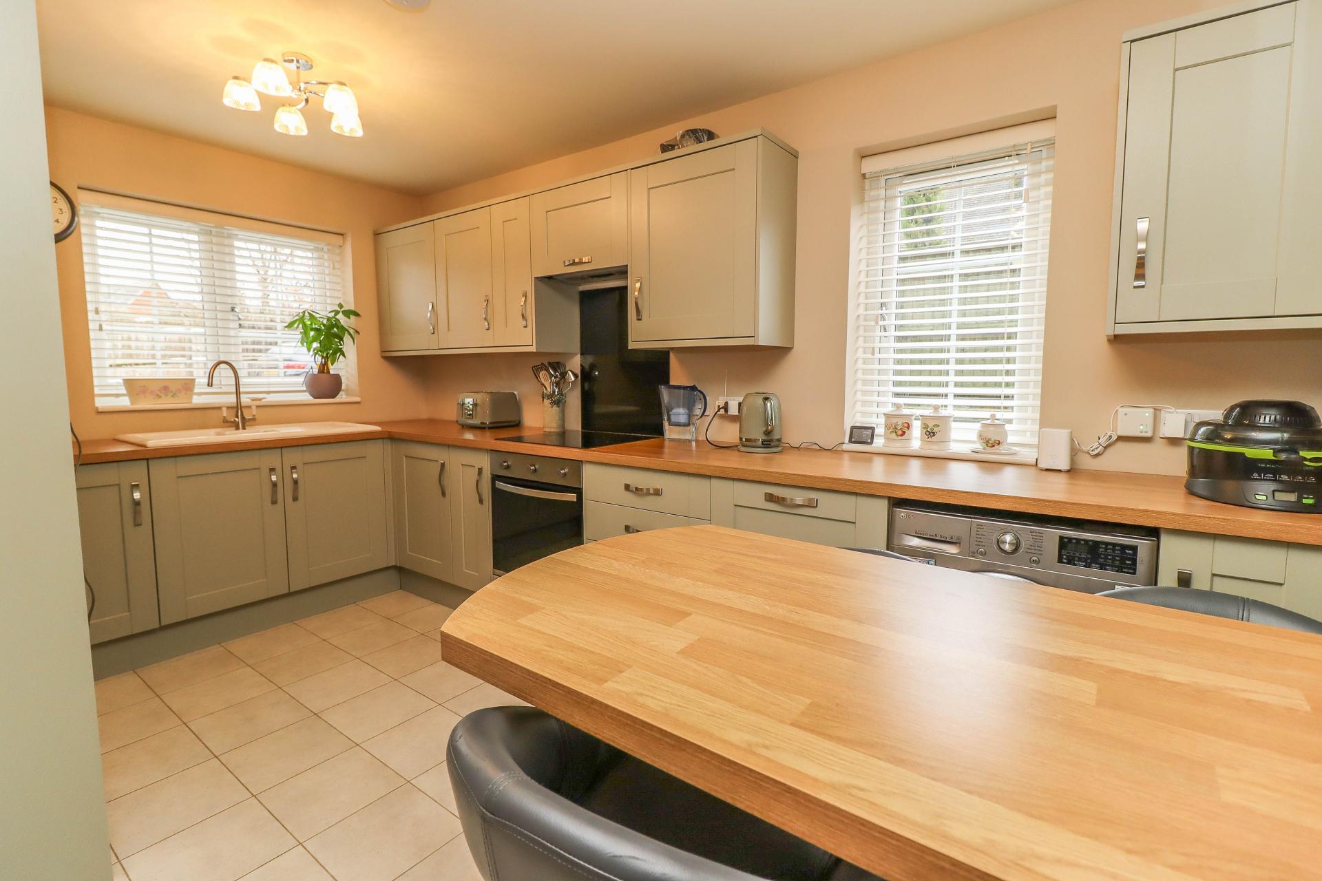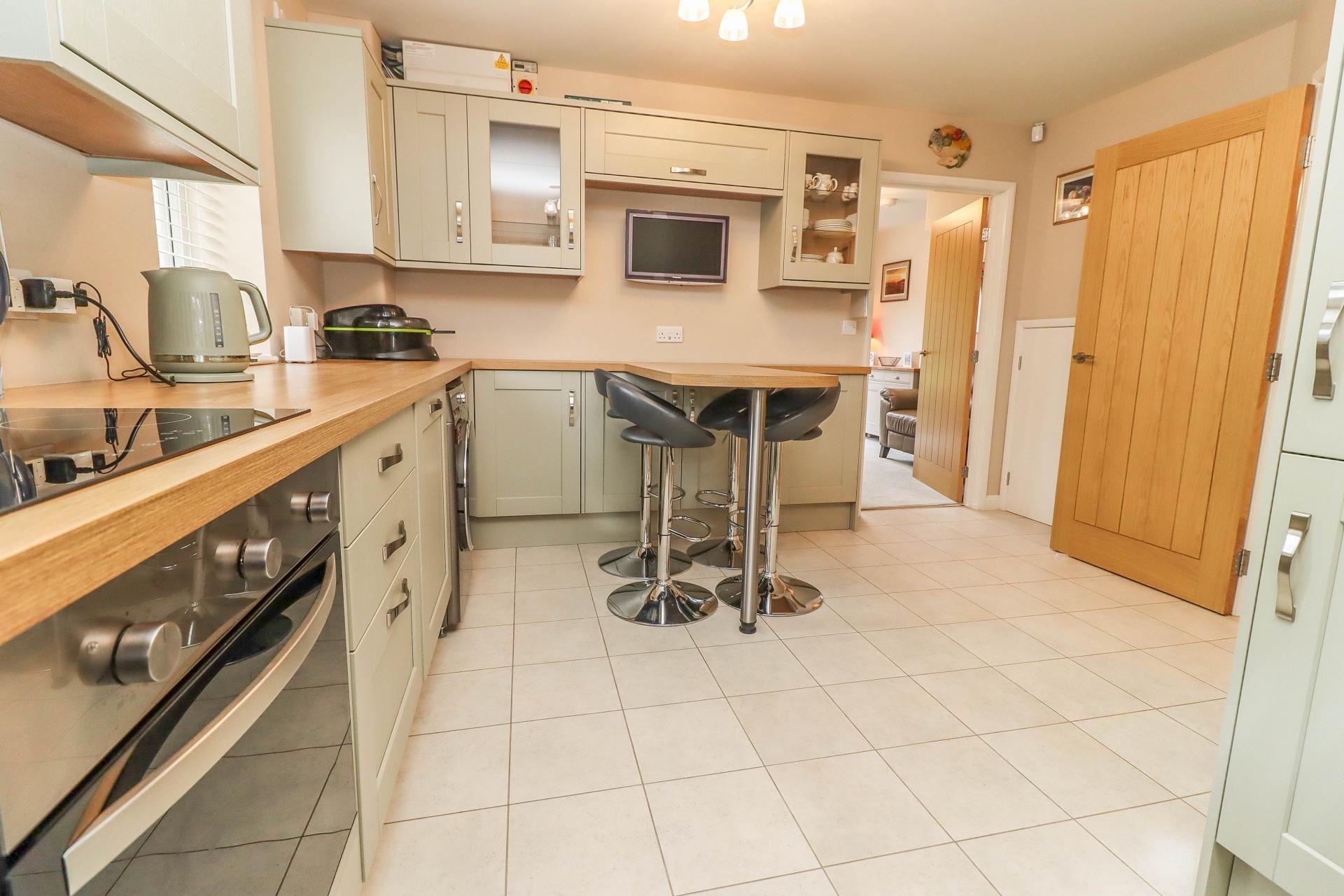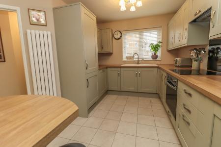 KITCHEN/BREAKFAST ROOM Ceramic 1½ bowl sink unit with mixer tap and drainer. Concealed water softener. An extensive range of pastel coloured high and low level cupboards and drawers. Long oak effect work surfaces, including peninsular breakfast bar on chrome post, surrounding dresser style unit with high level glazed china display cabinets. Under counter oven and grill, four ring ceramic hob above, coloured glass splashback, extractor fan and light over. Integrated fridge and freezer. Integrated dishwasher and recycling area. Recess and plumbing for washing machine. Ceramic tiled flooring throughout. Two ceiling light points. Windows to front and side aspect. Fuse box. Upright space saving radiator. Door to under stairs storage cupboard. Panelled door into: