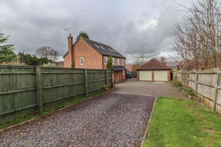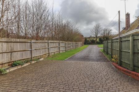 The property is set well back from the lane. Wide splayed paved approach onto long stone edged gravel driveway. Lawn extending to one side. Close boarded fencing to the boundary. Drive leads down to an extensive block paved frontage, running in front of Flint Cottage and the neighbour, providing access to the house and garage. Additional parking area to flank side of property where there is also oil tank and external boiler within insulated case. Curved brick retaining wall to side boundary with fencing above. Further parking space to the front of the garage and along the grass verge if required.
