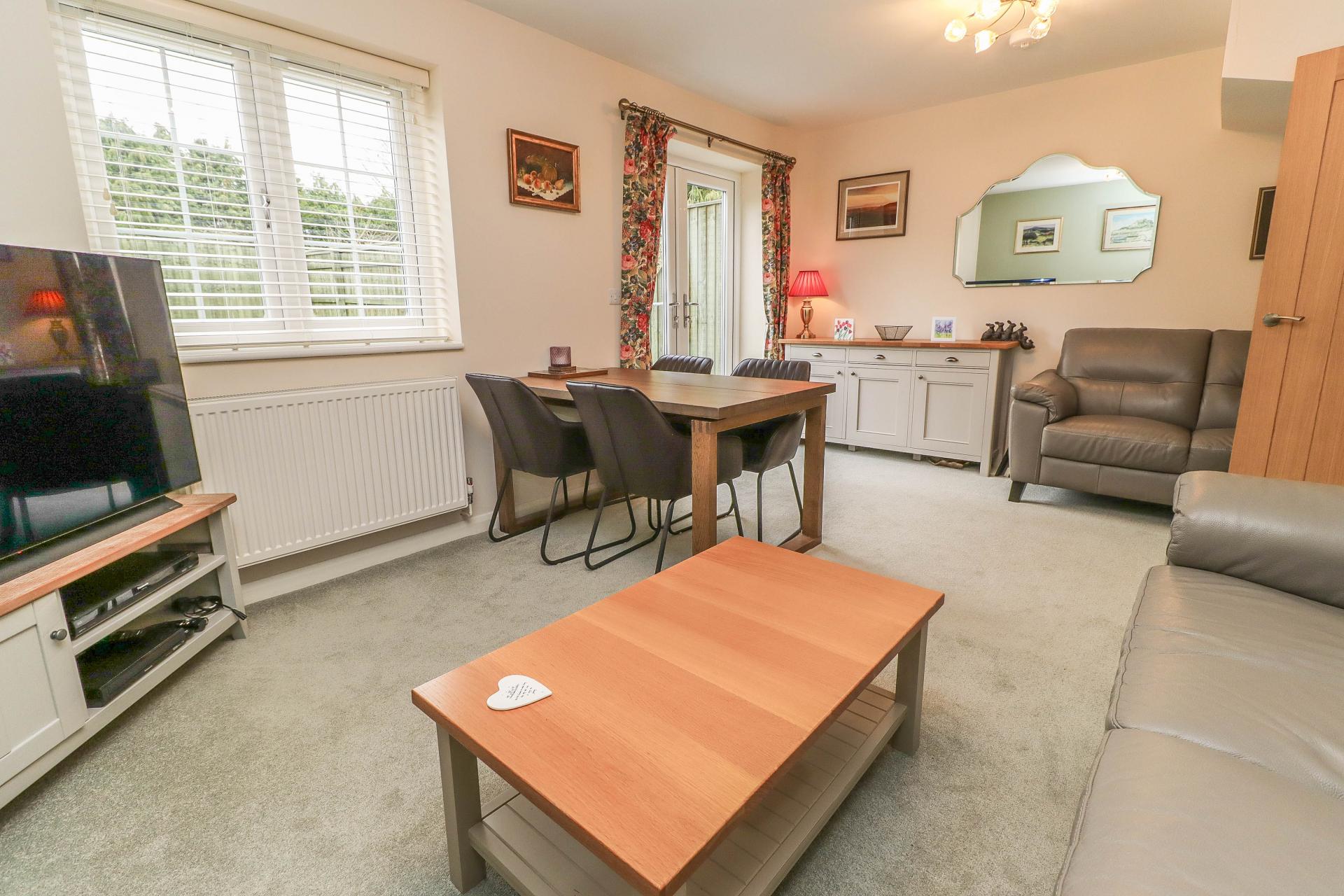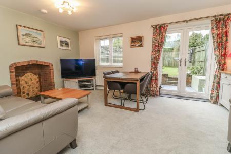 OPEN SITTING/DINING ROOM Large open brick fireplace with slate hearth. Glazed double doors and window to rear aspect opening onto the rear terrace and main garden. Two ceiling light points.