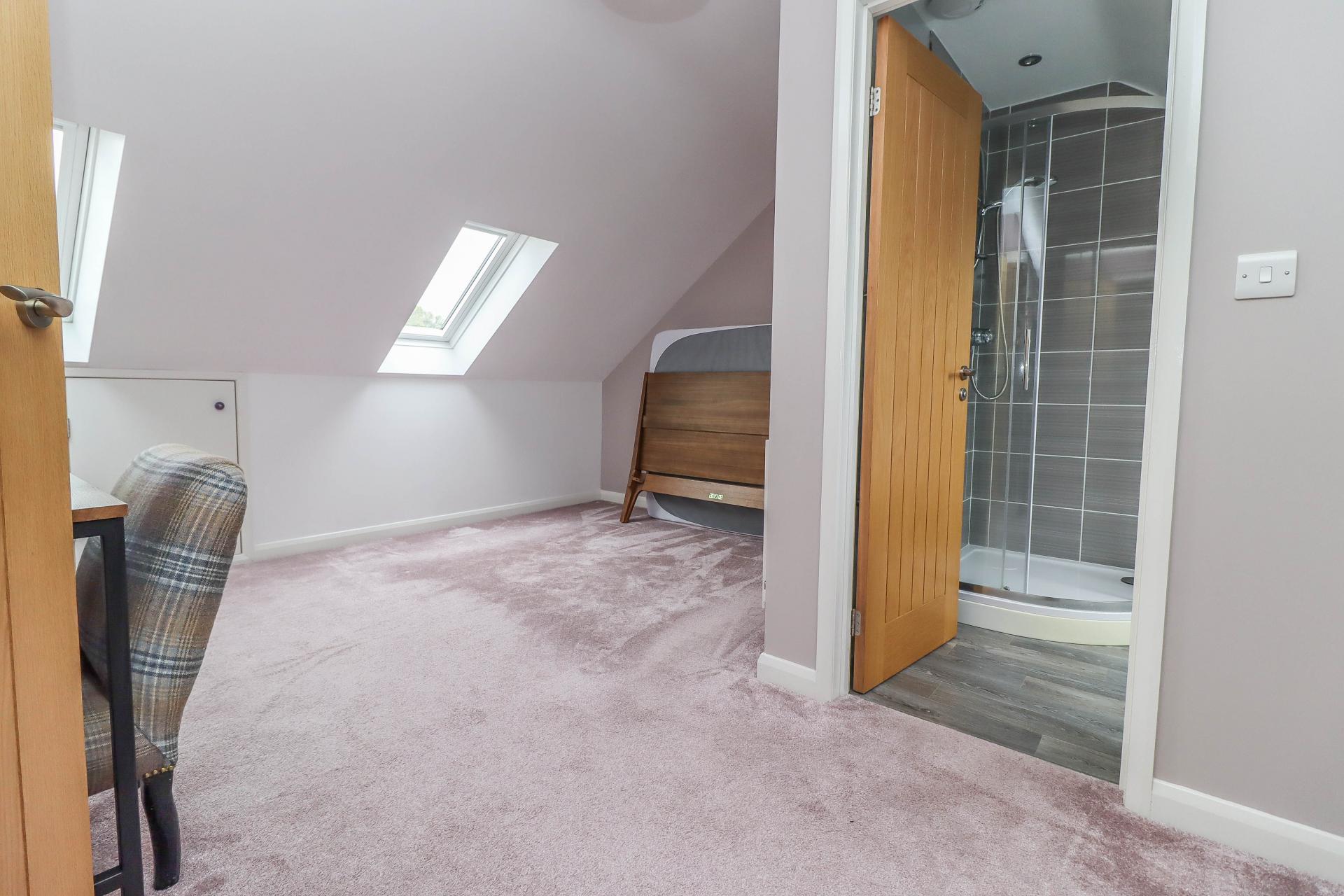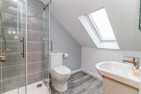 EN SUITE SHOWER ROOM White suite comprising basin with mixer tap, electric mirror above, double cupboard beneath. Low level WC. Corner curved glass/tiled shower enclosure with mixer shower. Limed oak effect flooring. Obscure glazed Velux skylight. LED down lighters and extractor fan. Chrome towel radiator.