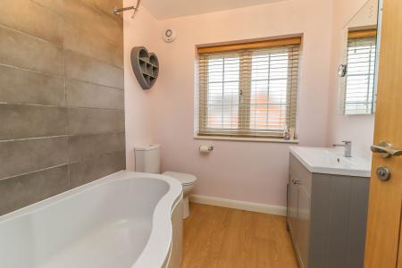 FAMILY BATHROOM White suite comprising wide contemporary wash hand basin with mixer tap and electric mirror above. Double cupboard beneath. Low level WC. P-shaped corner bath with side mixer tap, tiled surround and mixer shower above. Oak effect flooring. Obscure glazed window. Chrome towel radiator. Ceiling light point. Extractor fan.