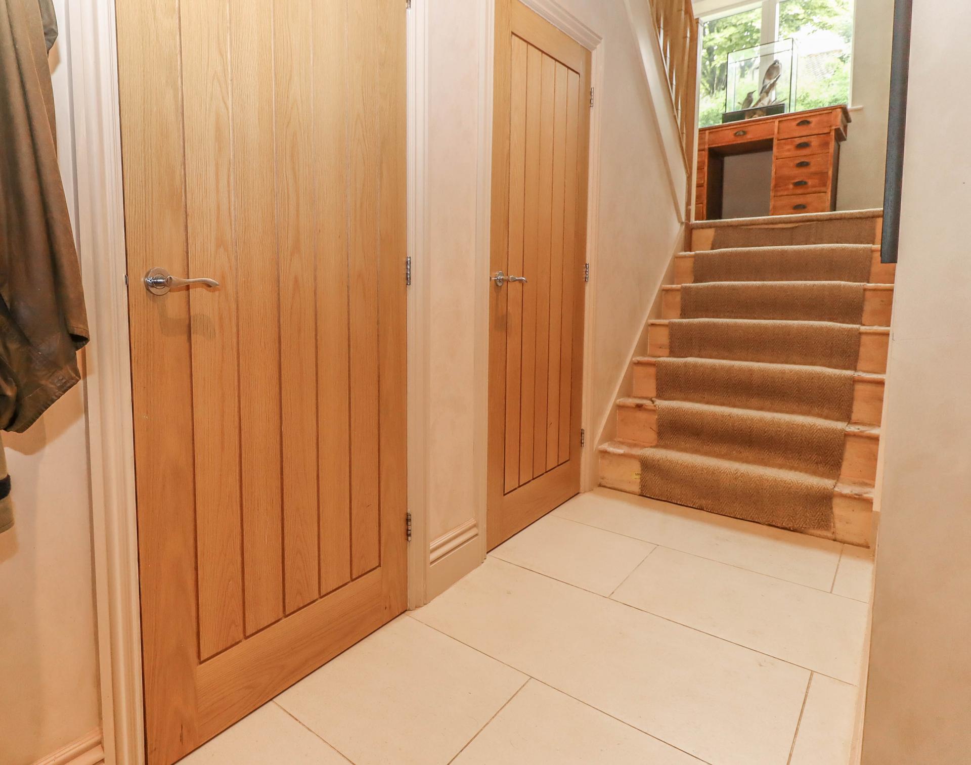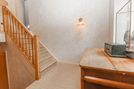RECEPTION HALL AREA Porcelain tiled floor. Dwarf wall with opening to side leading to kitchen/dining room. Turning oak staircase with quarter twist oak balustrade to side rising to upper ground floor and on to first floor. Doors to understairs cupboard and cloakroom.