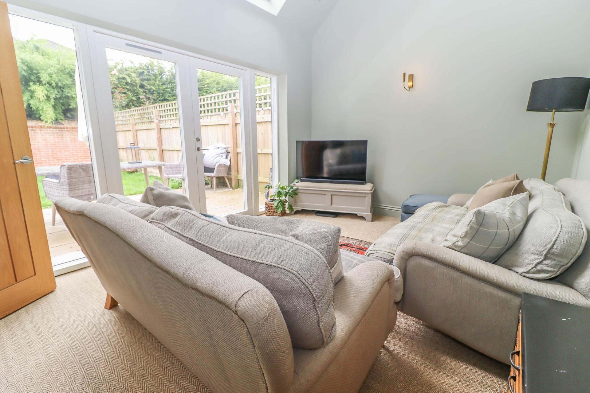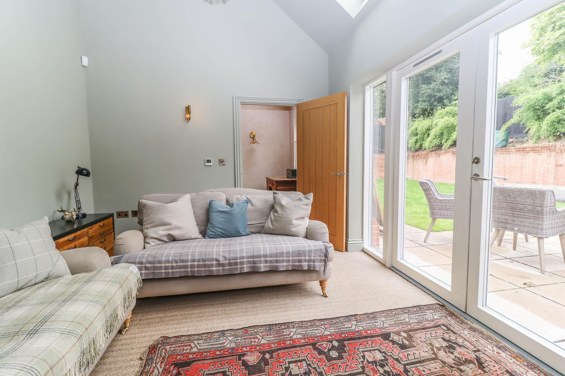 SITTING ROOM Glazed double doors with glazed panel to either side opening onto and overlooking the rear patio and garden. Two Velux sky lights above. Feature pendant light. Wall lights.