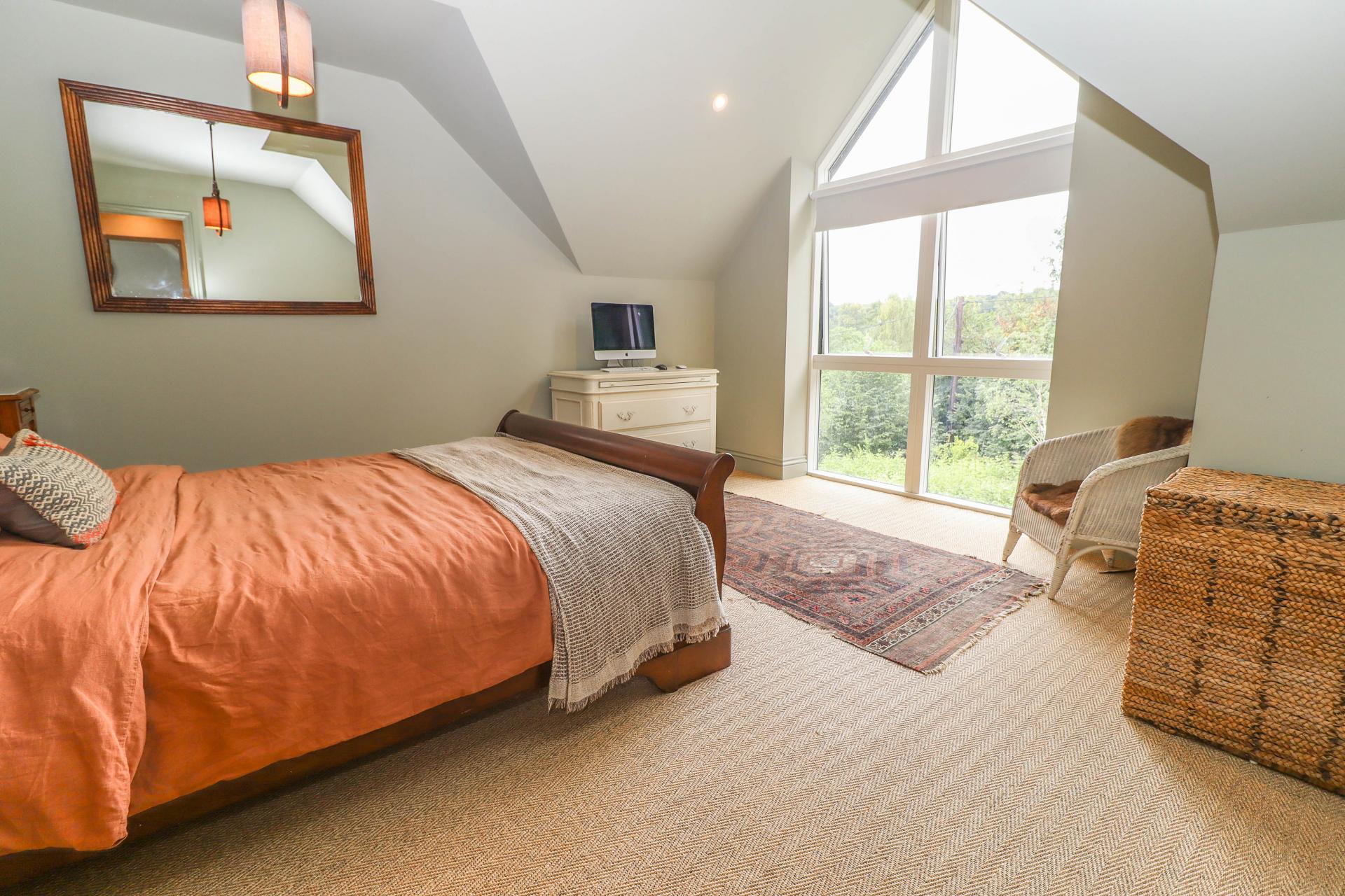 PRINCIPAL BEDROOM Featuring a large full height window to front aspect affording glorious views over the Bourne Valley. Pendant light point. Bed-head wall lights.