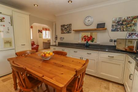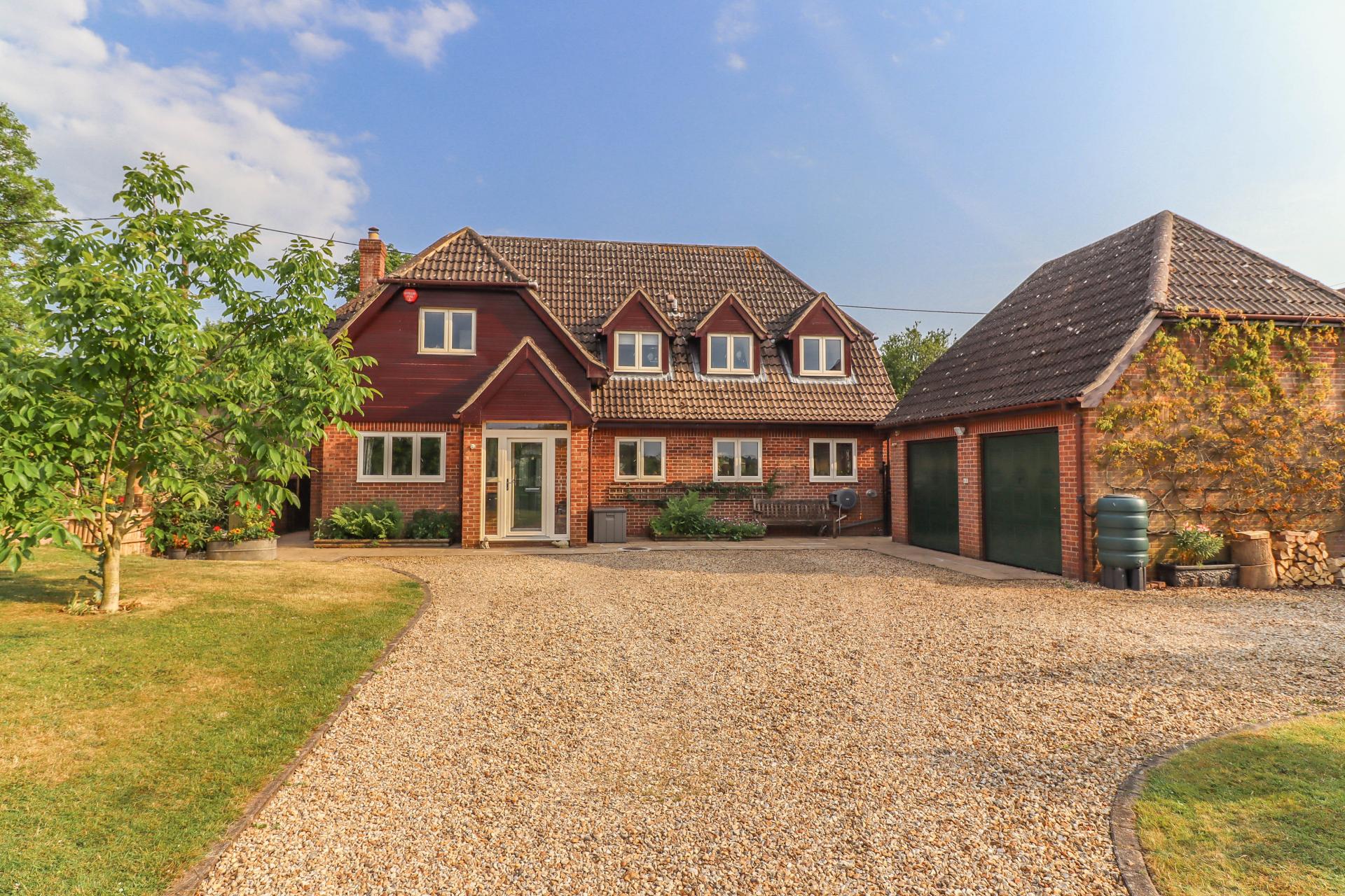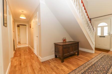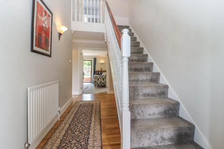 A detached family house constructed of mainly brick elevations under a tiled roof. The accommodation comprises a new entrance porch leading into a double height reception hall with cloakroom, three reception rooms, kitchen with adjoining breakfast room and utility. There are four good size bedrooms, one with a large en suite, and a family bathroom. The property has the additional benefit of a large detached double garage with spacious loft area offering potential. There is an attractive gated driveway with an interesting variety of specimen trees. The main southerly facing tiered garden has been impressively landscaped and stocked and is ideal for entertaining.