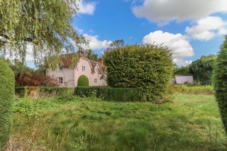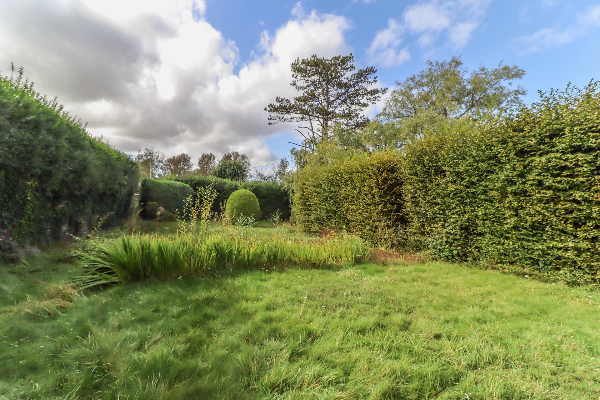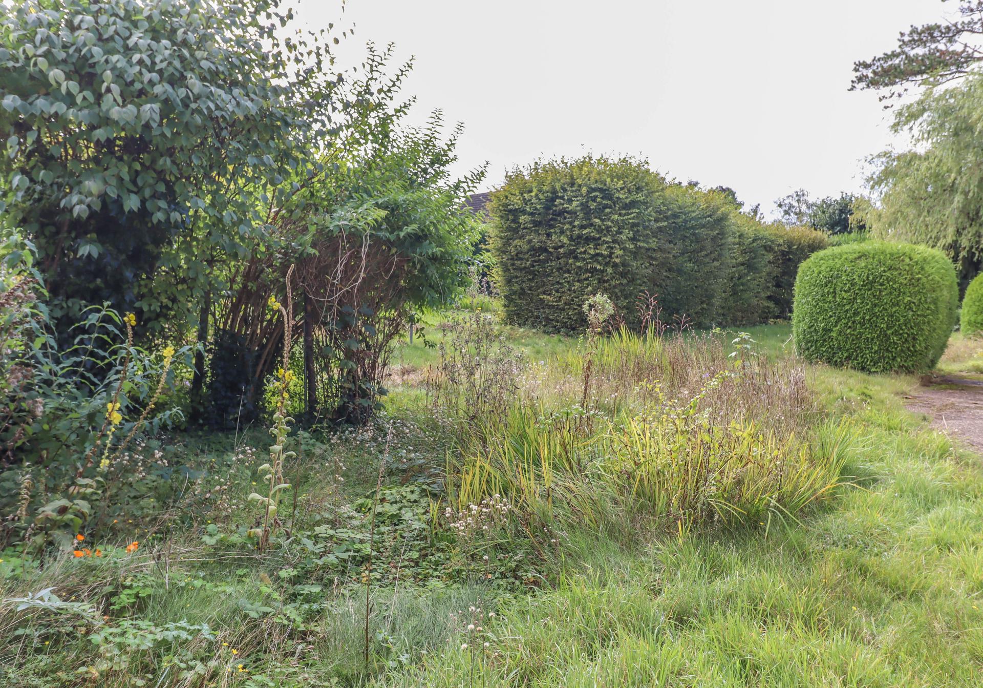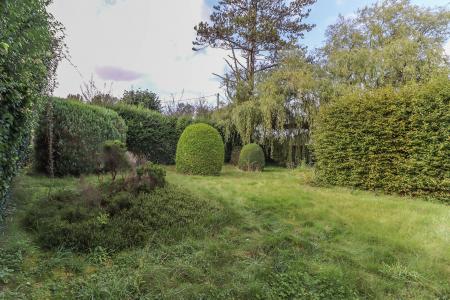 MAIN REAR GARDEN Level and secluded, laid to grass interspersed with hornbeam and box hedging. Topiary conifer and yew trees. Garden shed. Weeping willow to boundary.