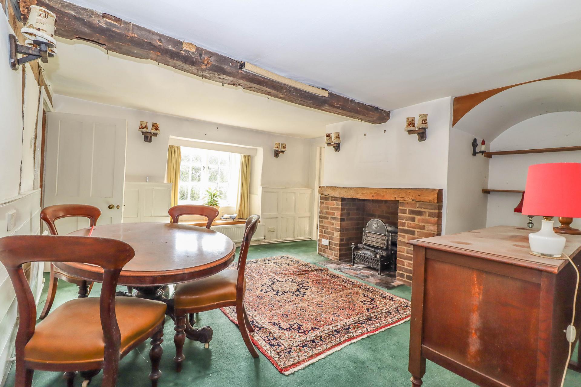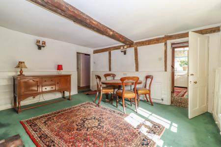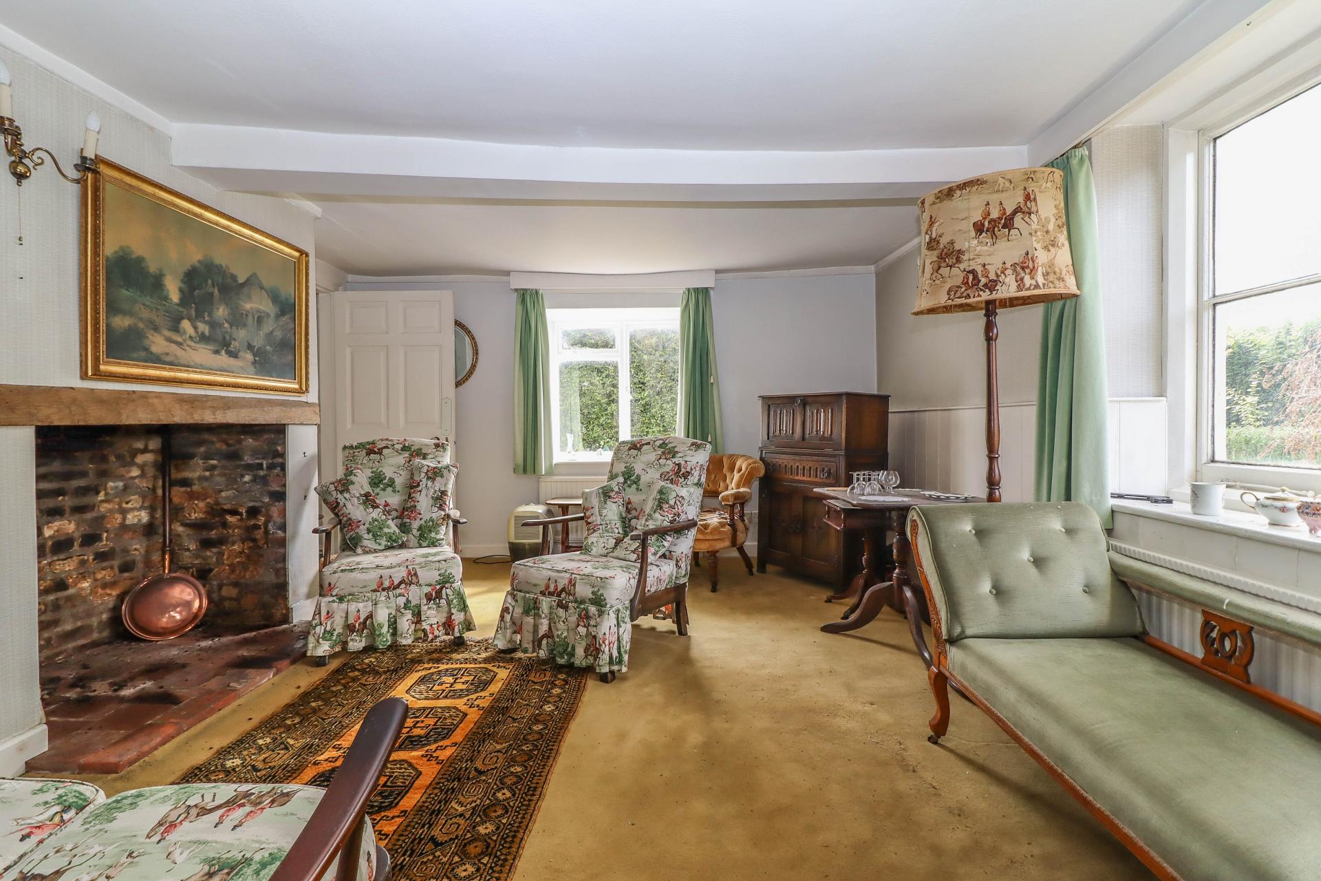 SITTING ROOM (Large triple aspect reception room) Open brick fireplace with brick quarry tiled/brick hearth, beam above and substantial chimney breast. Windows to rear and side aspect. Bay window to front aspect. Part T&G panelling onto two walls. Wall light points. Panel door into: