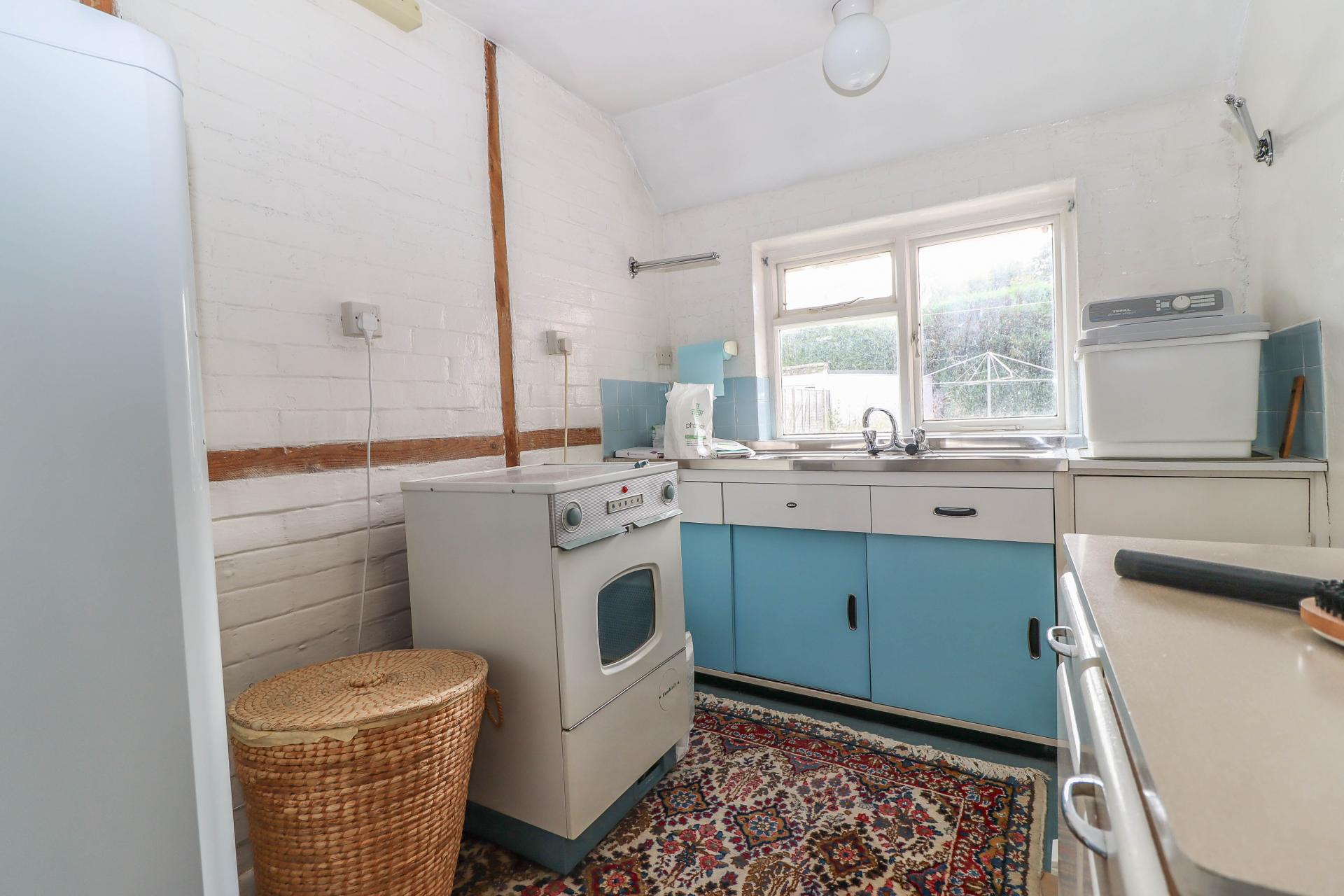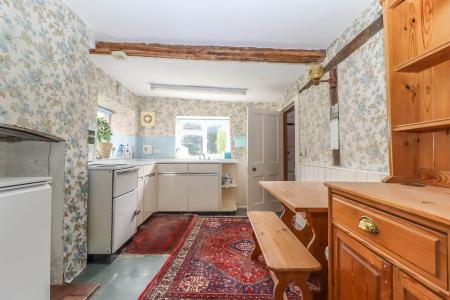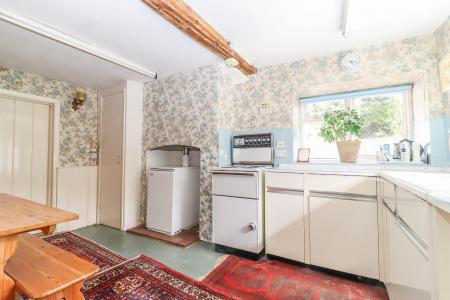 KITCHEN / BREAKFAST ROOM Cupboards and drawers with work surface over. Free-standing cooker. Windows to rear and side aspect. Exposed ceiling beam. Strip light. Part panelled walls. Wall light points. Cupboard. Latch door to: