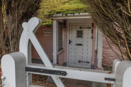 The front of the cottage is screened by a long brick wall and high conifer hedging. Picket gate and path leading to front entrance porch. Path continues around the front of the property and through a gate leading into the main rear garden.