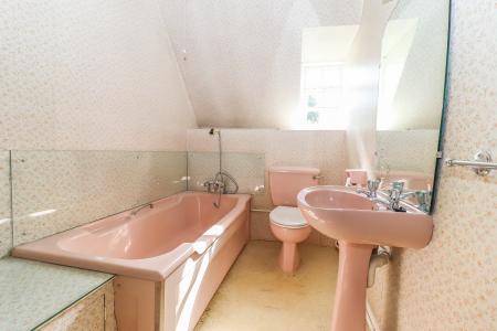 FAMILY BATHROOM Suite comprising cast iron bath, pedestal wash hand basin and WC. Glass topped cupboard. Window to rear aspect. Loft hatch.