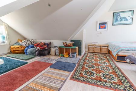 BEDROOM TWO (Ideal teenager’s bed/sitting room with reduced ceiling height and skeiling ceilings) Dormer window to front aspect. Velux window to rear aspect. Built-in cupboards. Spot lights. Exposed pine floor boards. Eaves storage.
