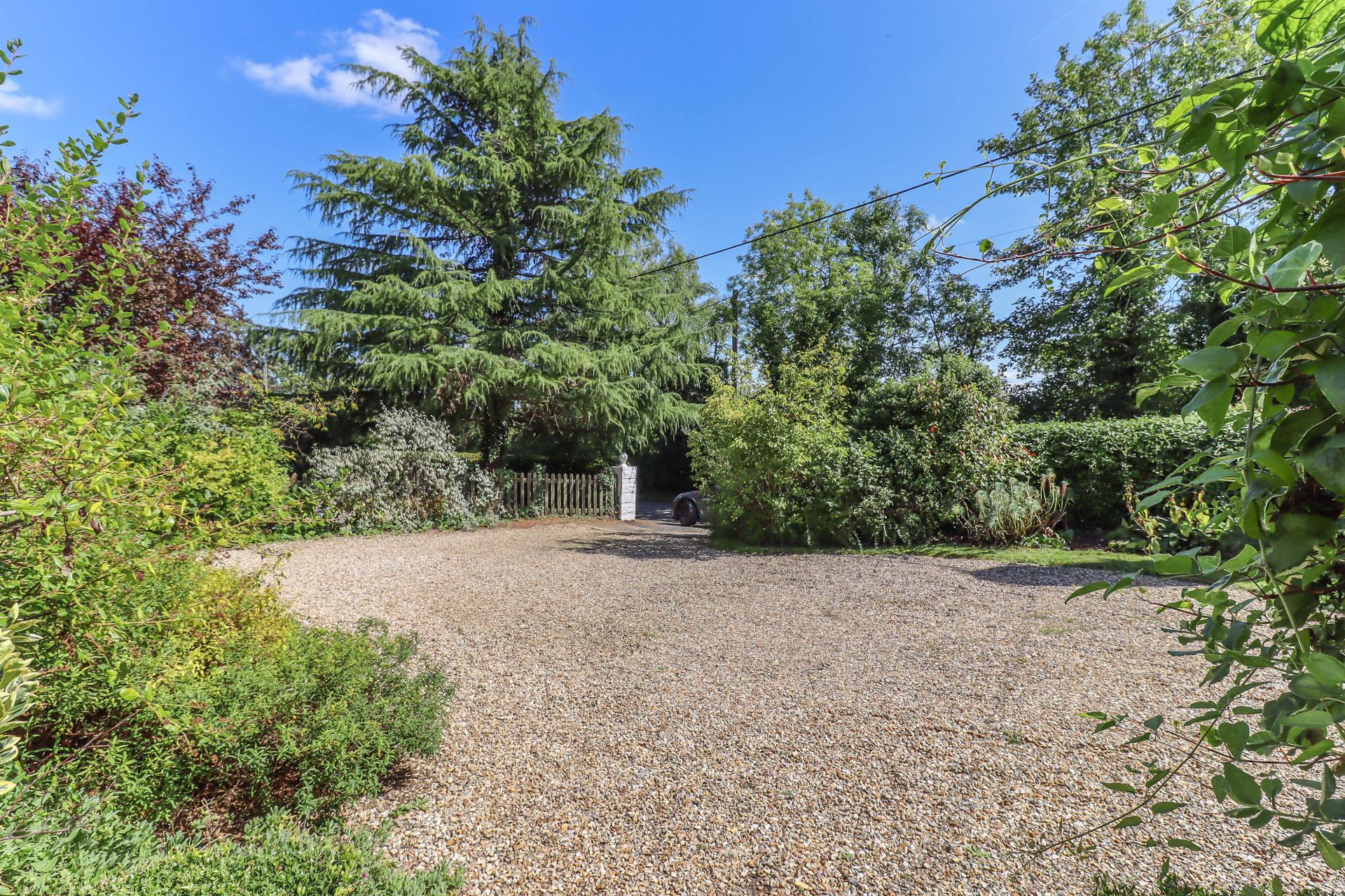 Splayed tarmac access off village lane through stone piers onto a generous gravelled driveway providing ample parking surrounded by areas of lawn and well stocked borders, well screened on all boundaries by high mixed hedging. Gate leading into: