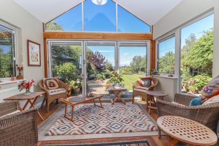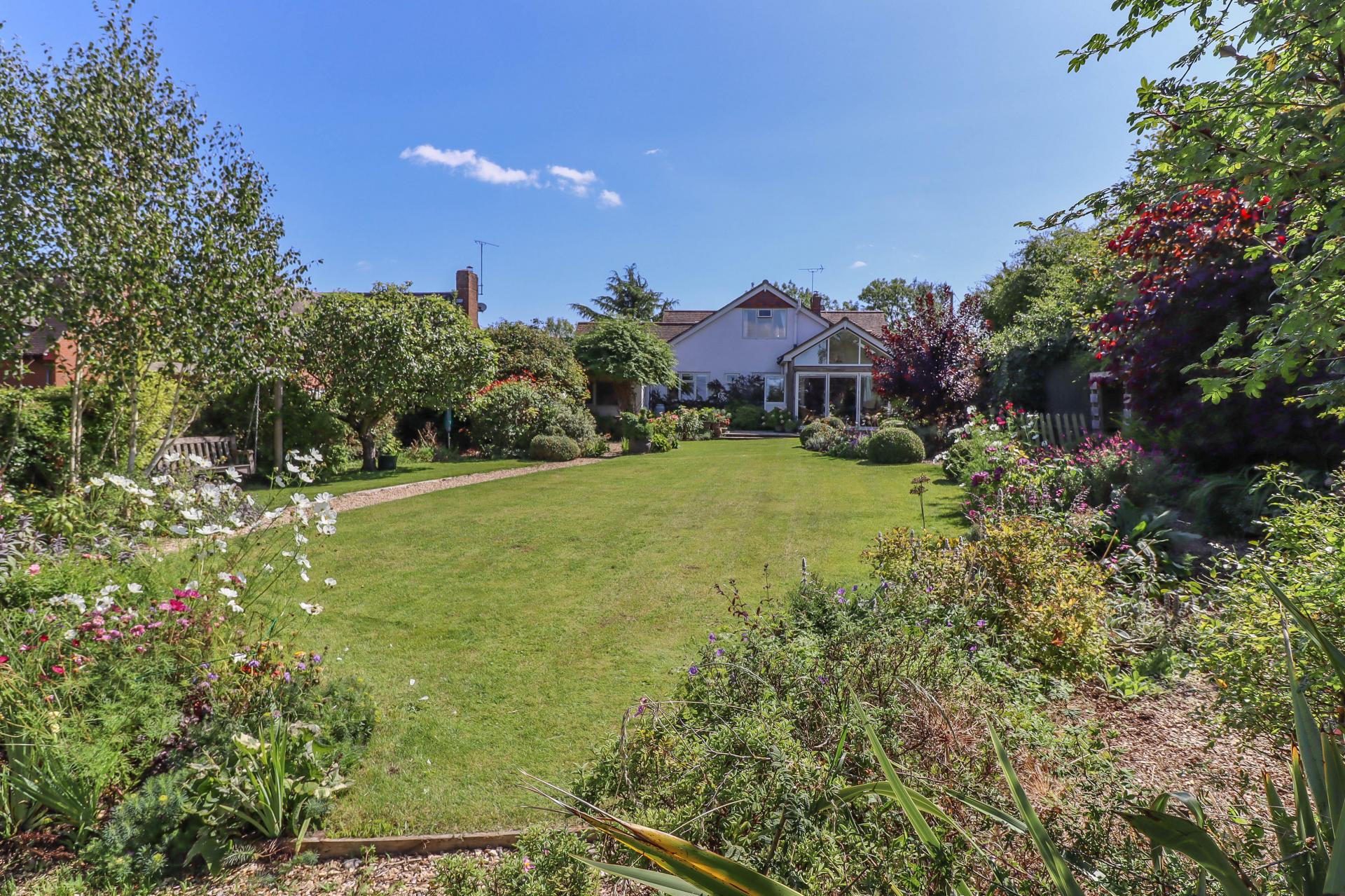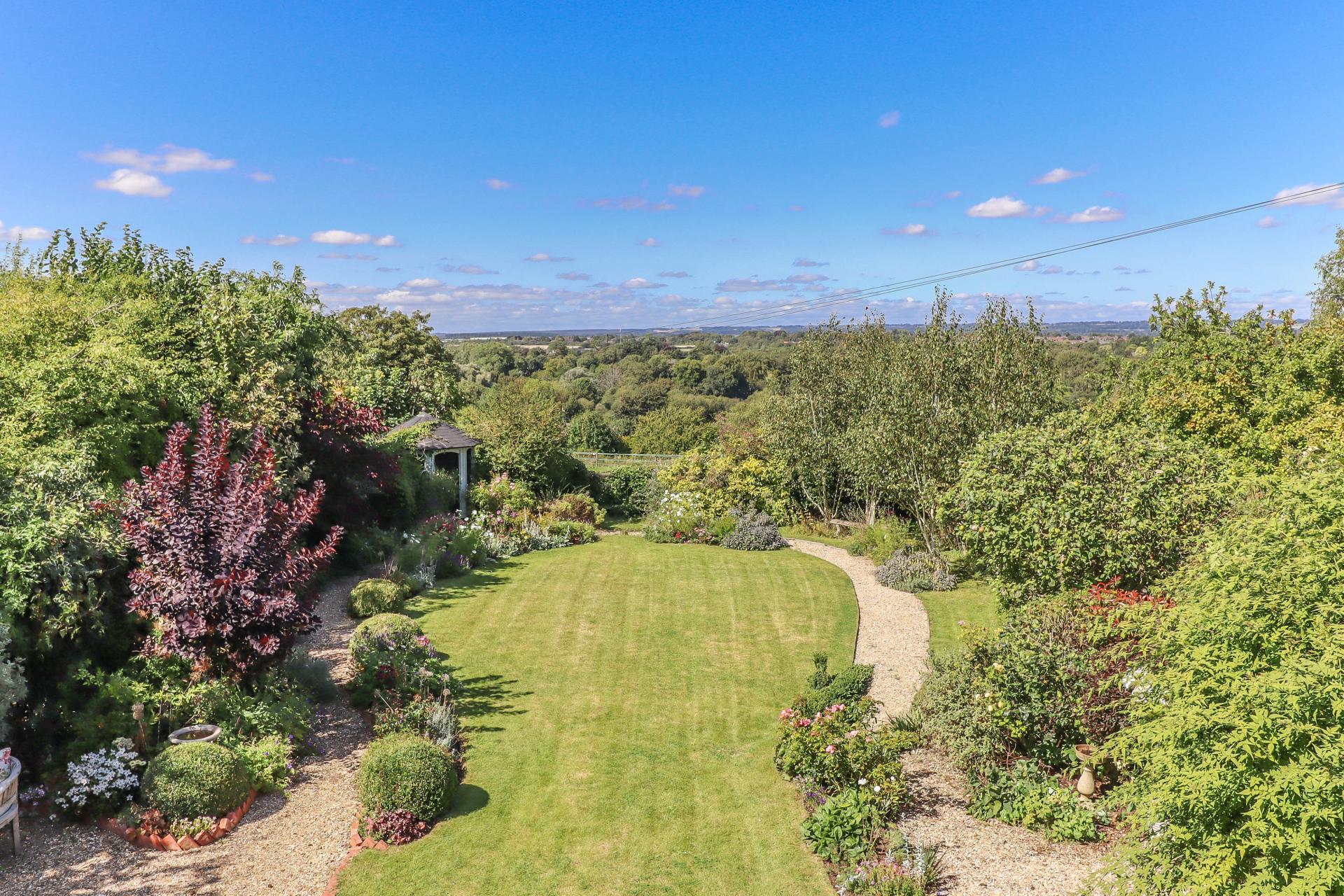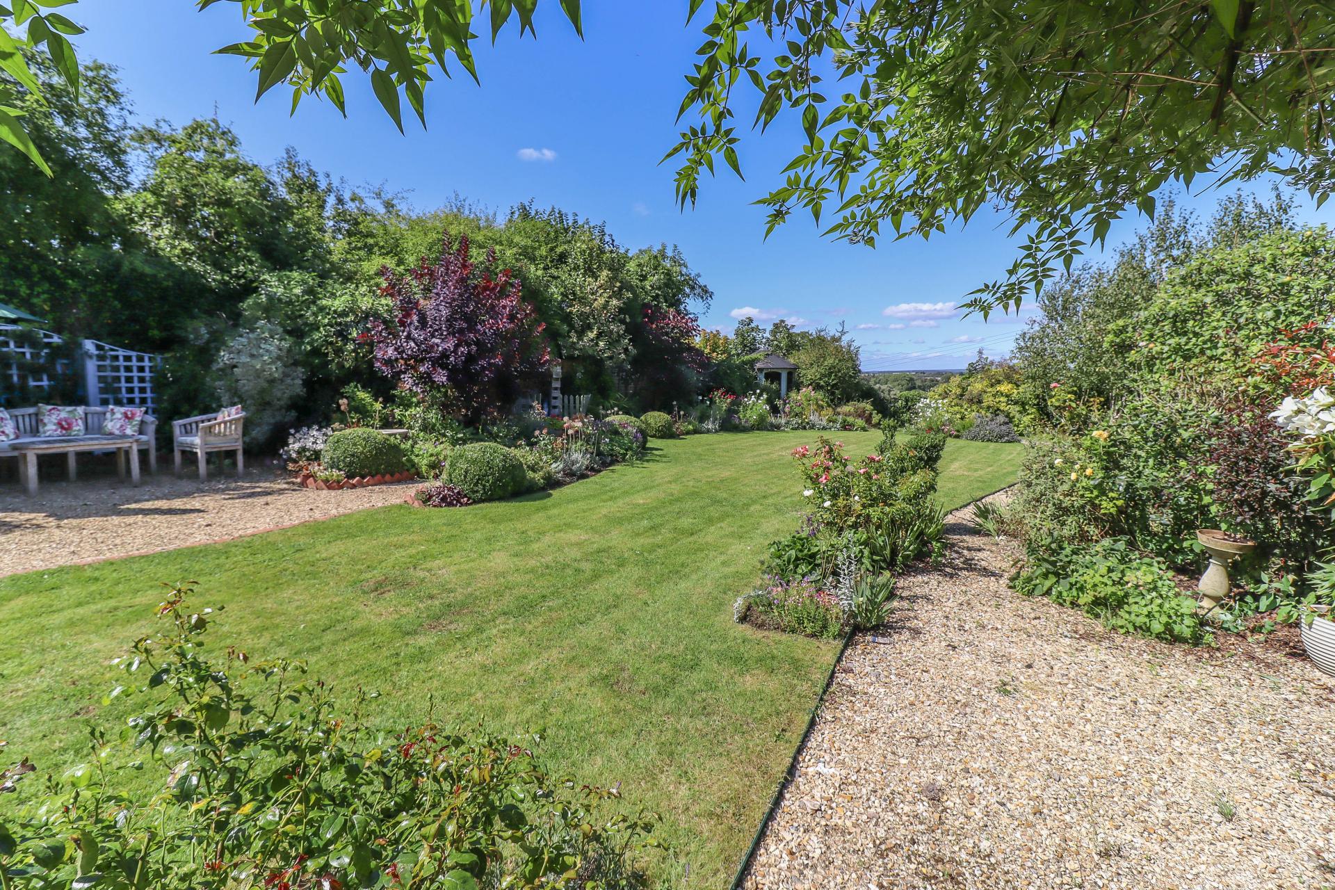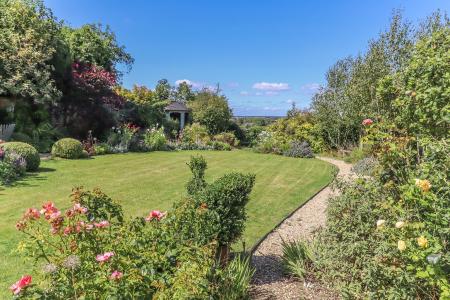 MAIN REAR GARDEN A stunning feature of the property from where distant views are enjoyed at the rear boundary over the lowered hedging. Split level sandstone terrace ideal for entertaining, part covered by a pergola and climbers. Lawn with block edged shingle path. Well stocked borders divided by topiary buxus balls. Shingle terrace area with trellis to rear. Summerhouse (in need of restoration). Garden shed. Gazebo. Mature fruit and ornamental trees. The garden enjoys a high degree of privacy and it is well enclosed on all boundaries by hedging and mature trees.