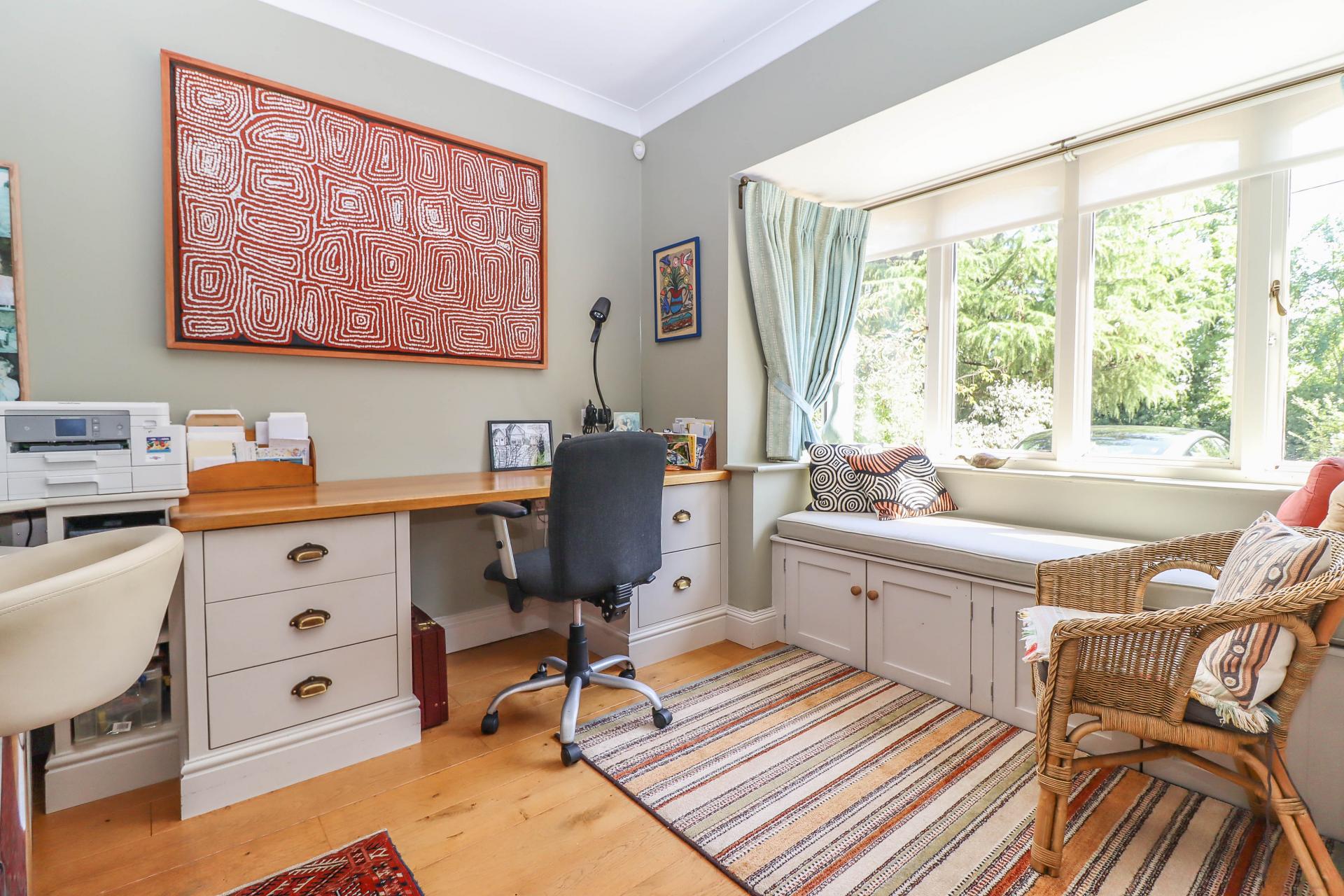 STUDY / LIBRARY Bay window to front aspect with built-in window seat, storage beneath. Range of built-in furniture comprising two desks, drawers, shelving and dresser unit. Coving. Spot lights. Oak flooring.