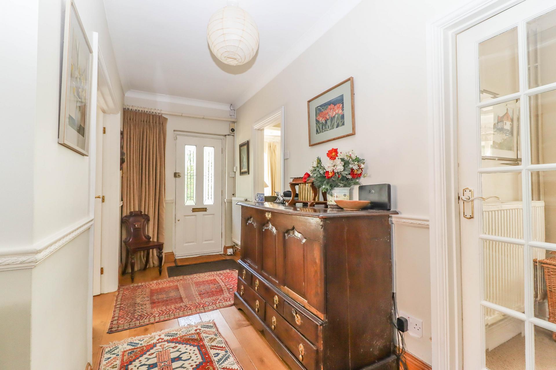 RECEPTION HALL Part divided by arch. Oak flooring and skirting boards. Dado rail. Staircase with carpet runner and balustrade rising to first floor. Alcove beneath stairs with coat hooks and cupboard. Coving. Two pendant light points.