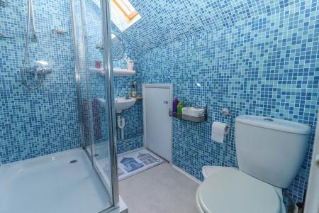 SHOWER ROOM Fully tiled with white suite comprising wash hand basin, mirror and shelf above. Low level WC. Glass/tiled shower enclosure. Eaves storage. Velux window. Down lighters. Extractor fan.