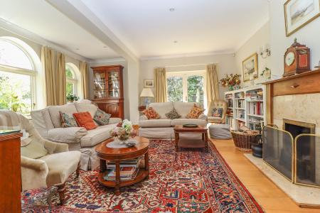 DRAWING ROOM (Large elegant triple aspect reception room) Open fireplace with granite hearth surround and oak mantelpiece. Recess to either side of chimney breast, one with built-in media cupboard. Three large arched window to front aspect. Glazed double doors to side aspect and window to opposite aspect. Oak flooring and skirting boards. Coving. Down lighters. Wall lights.