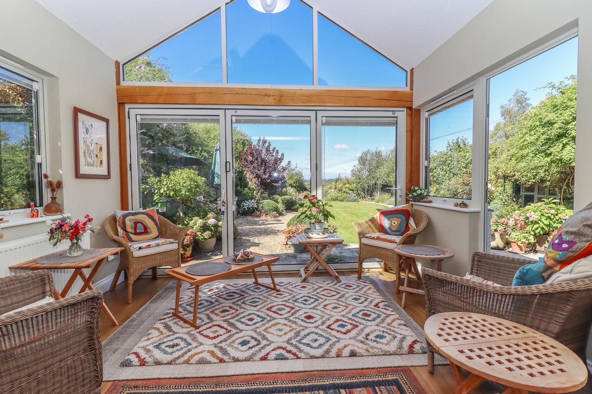 GARDEN ROOM An excellent recent extension featuring a fully glazed gable end and oak frame to the rear aspect with folding aluminium framed doors leading onto the terrace and affording stunning views over the garden and distant countryside. Vaulted ceiling with pendant light point and Velux roof light. Windows to either side aspect and part glazed door leading onto terrace. Oak flooring.