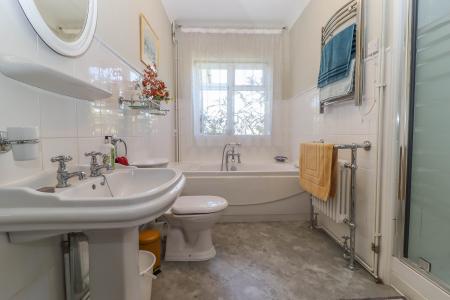 FAMILY BATHROOM White suite comprising pedestal wash hand basin with shelf. Low level WC. Panelled double ended bath with mixer tap/shower attachment, tiled surround. Traditional style radiator/towel rail. Large tiled enclosure with Aqualisa shower. Tiled floor and part tiled walls. Window to rear aspect. Spot lights.