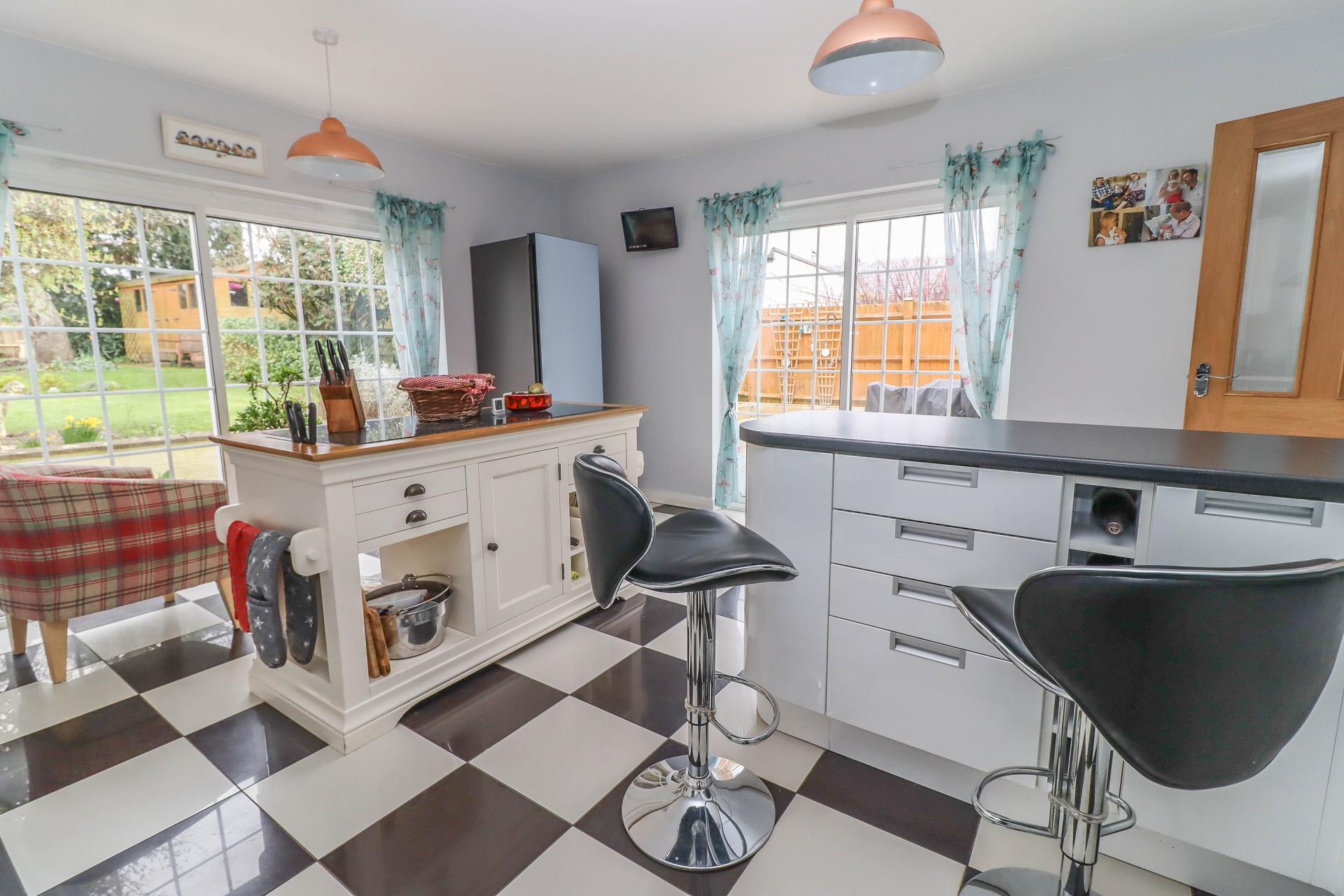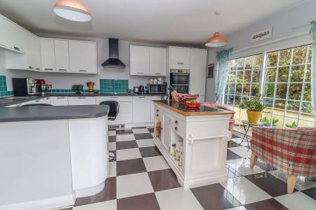 KITCHEN / BREAKFAST ROOM (Large light and airy dual aspect living space with electric underfloor heating) Stainless steel sink unit with drainer, mixer tap and drinking water tap. Long roll top work surfaces including peninsular unit with ceramic tiled splashbacks. A range of high and low level cupboards and drawers. Integrated Bosch double oven with grill. Four zone induction hob with extractor above. Integrated dishwasher. Integrated under counter freezer. Space for tall larder fridge. Plinth heater. Two pendant light points. Substantial sliding glazed doors to rear and side aspects overlooking the garden and opening onto the main patio. Ceramic tiled flooring. Space for family dining table or seating.
