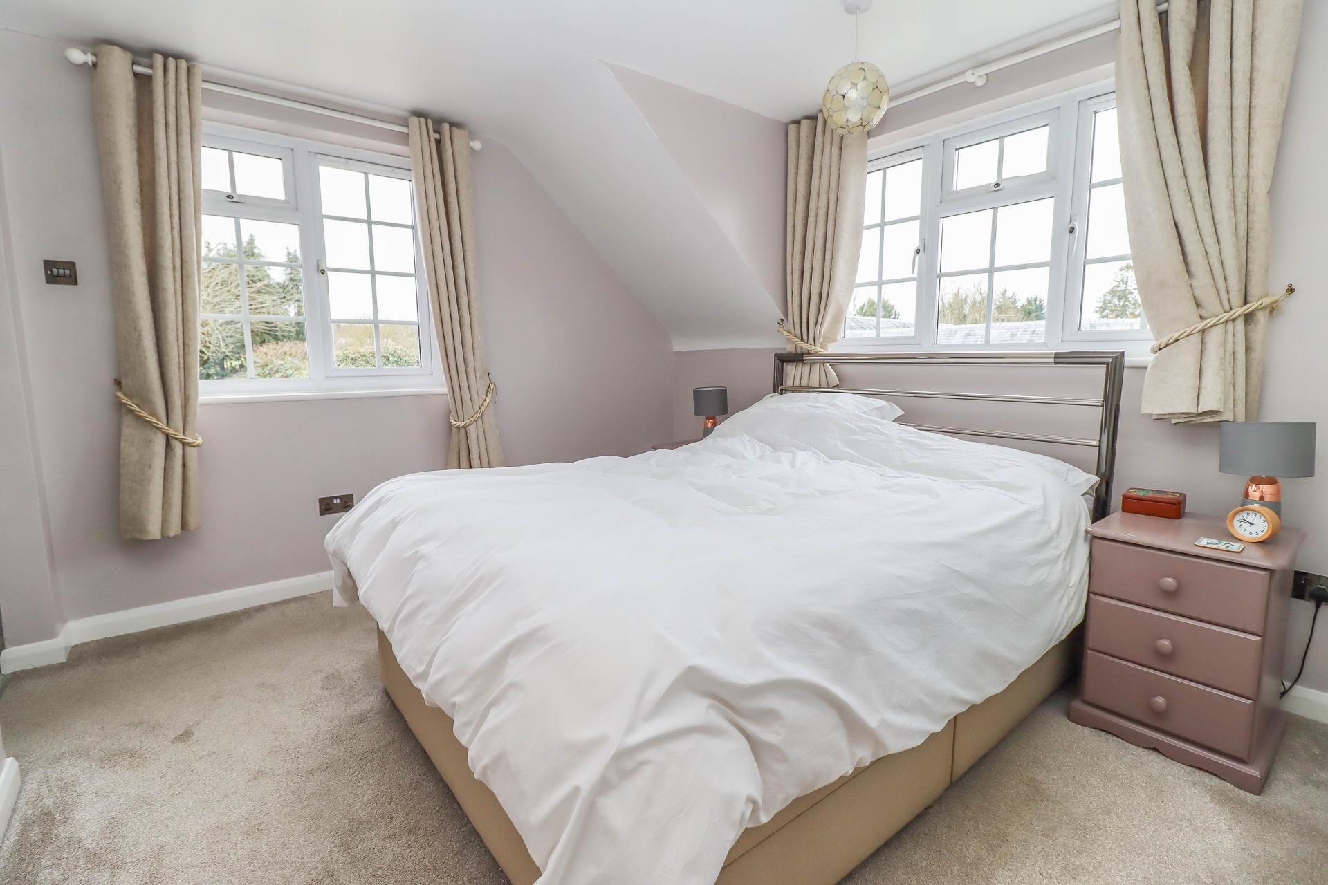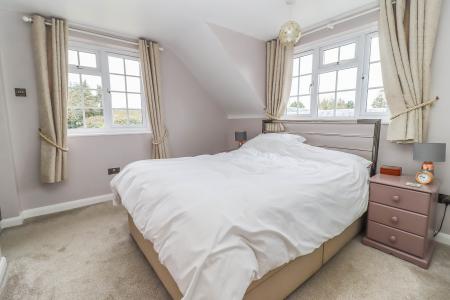 PRINCIPAL BEDROOM (Dual aspect double bedroom) Window overlooking the rear garden to fields beyond. Further large dormer picture window to side aspect. Built-in wardrobe with sliding doors, one mirror fronted. Pendant light point. Open arch into: