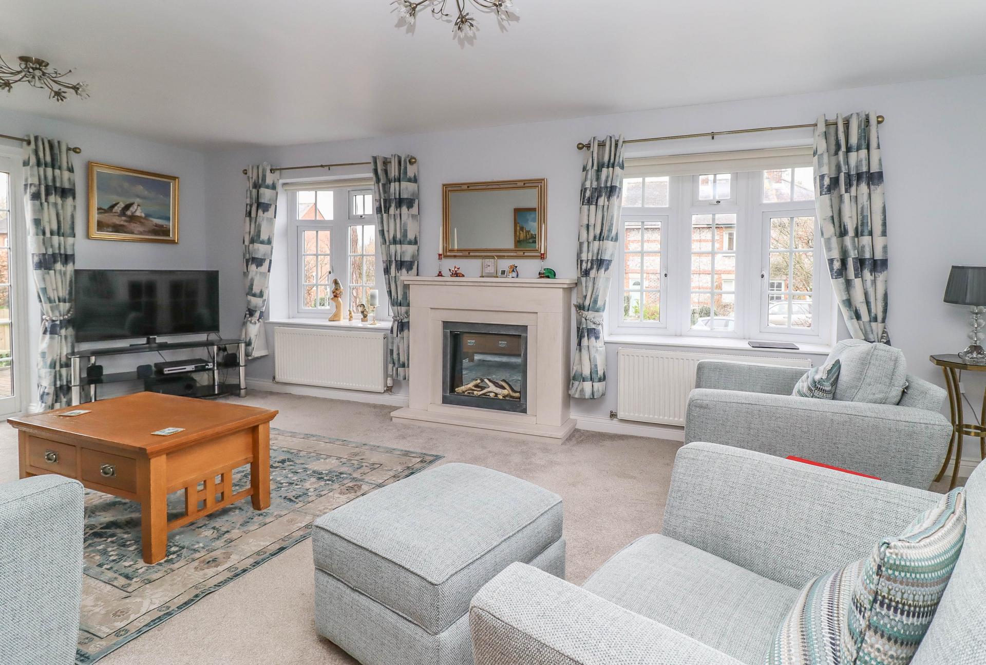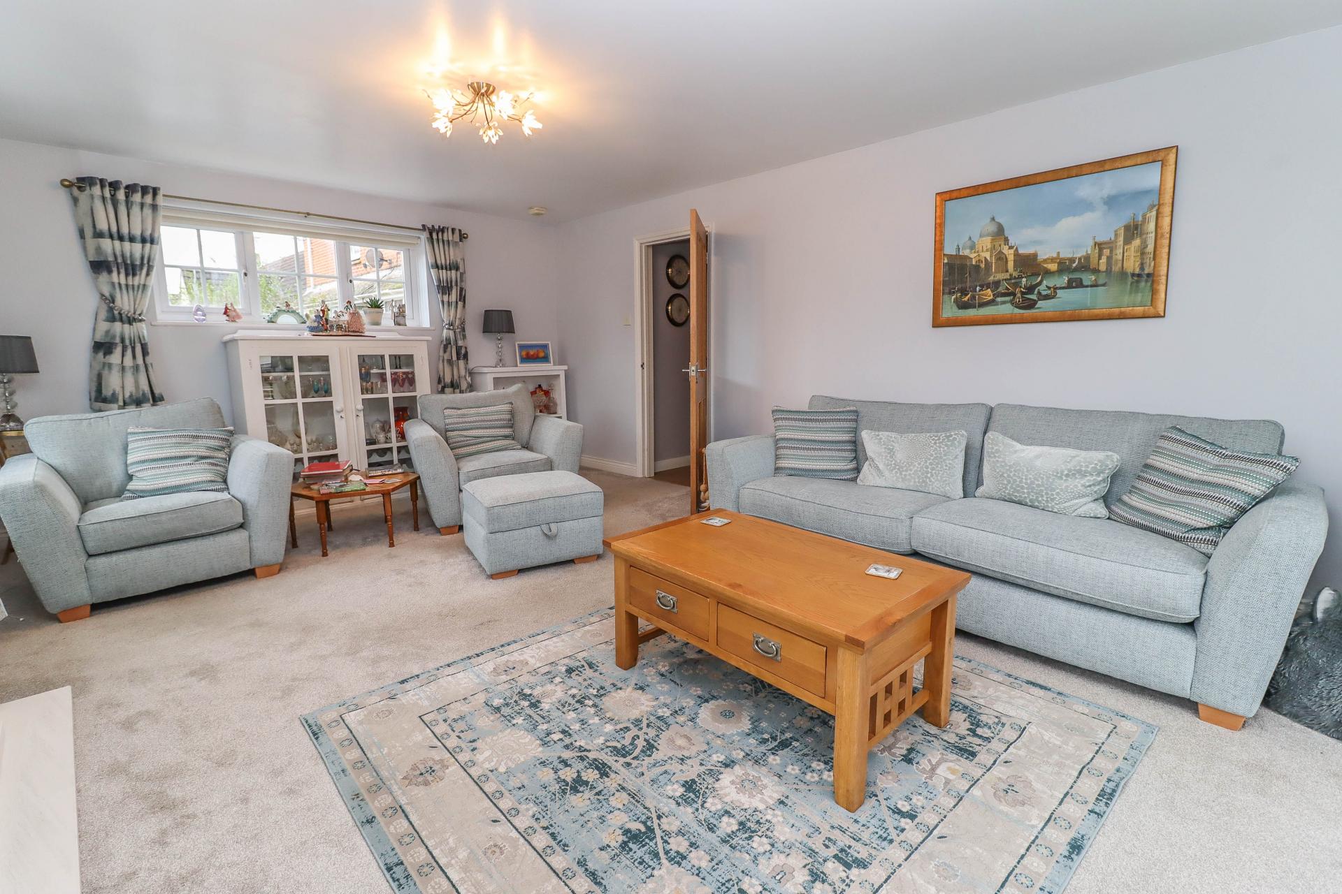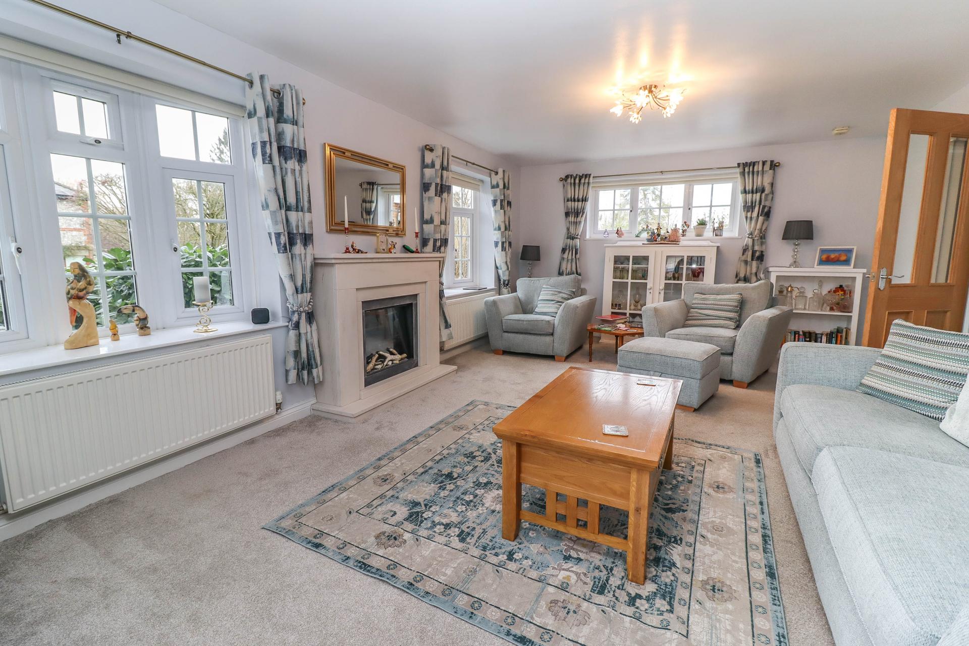 LIVING ROOM (Large light and airy triple aspect reception room) Feature electric fireplace with attractive limestone mantlepiece and hearth. Two bay picture windows to front aspect, each with deep display sills. High picture window to side aspect. Glazed door to opposite aspect opening onto driveway and front garden. Two ceiling light points.