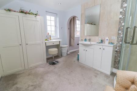 En suite shower room / dressing room: (Spacious) White basin with mixer tap. Bevel edged mirror above. Roll top sill to one side, cupboards beneath. Shaver socket over. Low level WC. Quadrant curved glass/tiled shower enclosure with overhead shower. Built-in wardrobes. Curved dressing table to one end. Recessed down lighters. Obscure glazed windows on two aspects. Chrome towel radiator. Extractor fan.