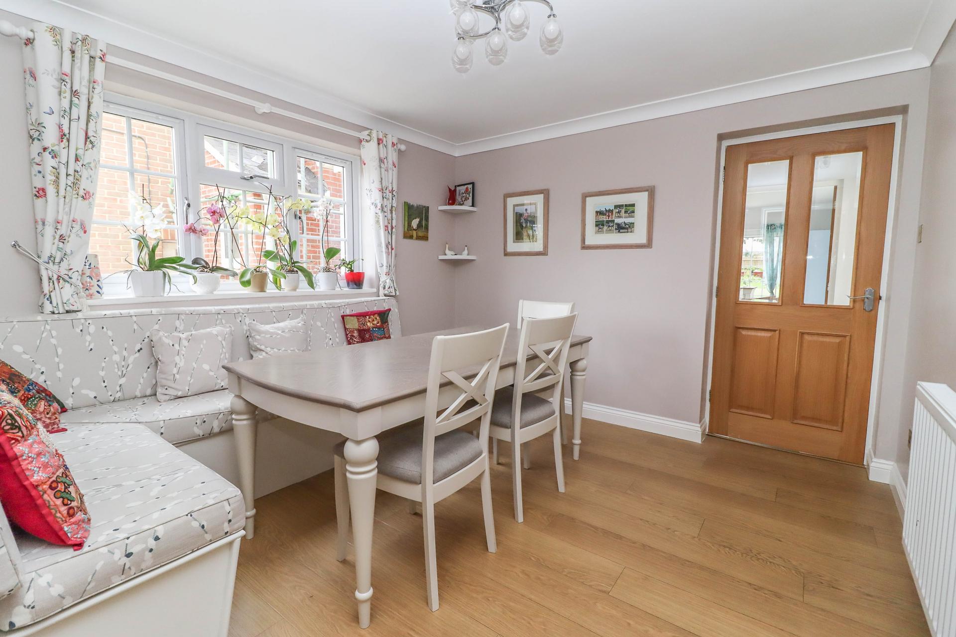 DINING ROOM Picture window to side aspect. Oak effect flooring. Ceiling light point. Coving. Built-in L-shaped bench to one corner extending beneath window. Part bevel glazed oak panelled door into: